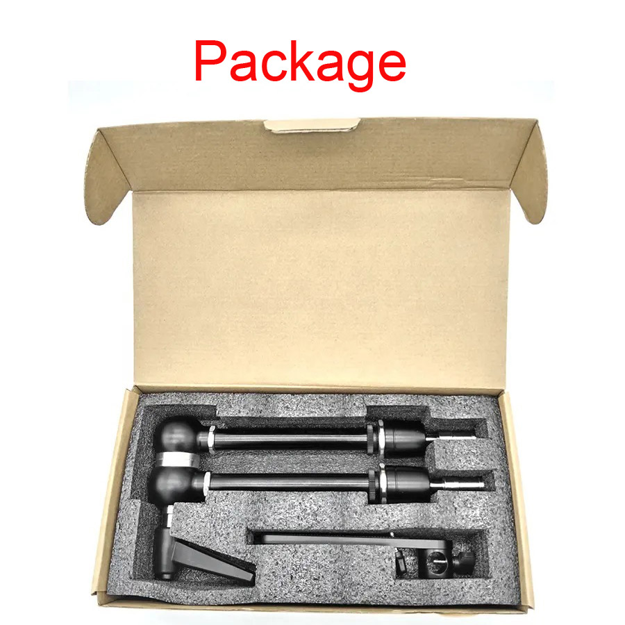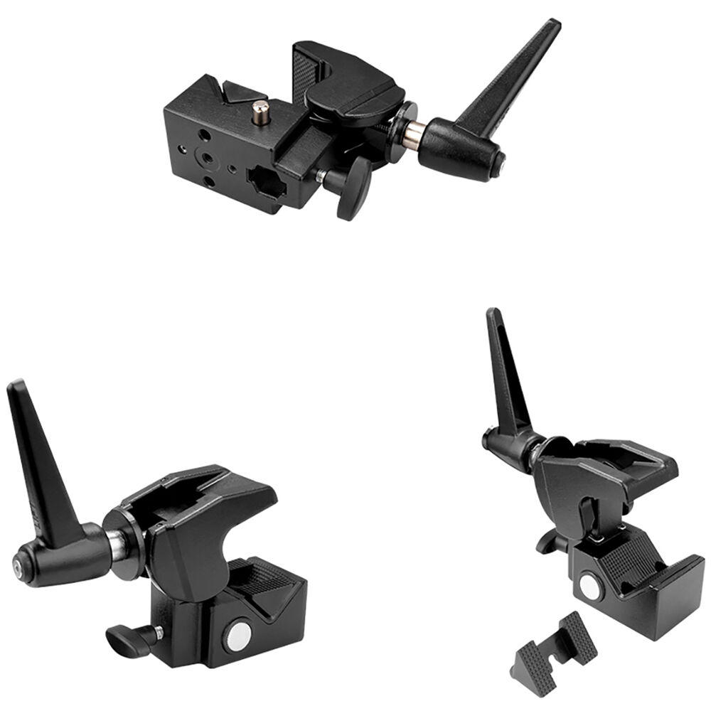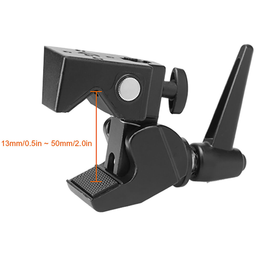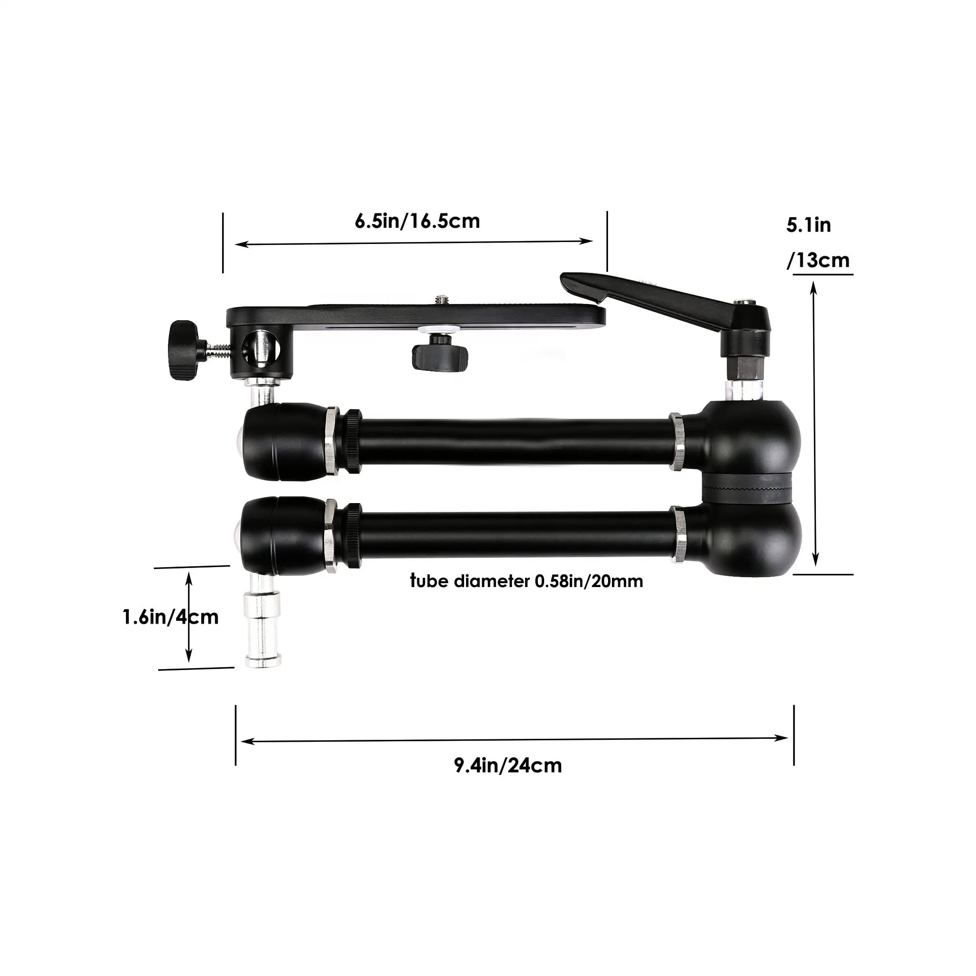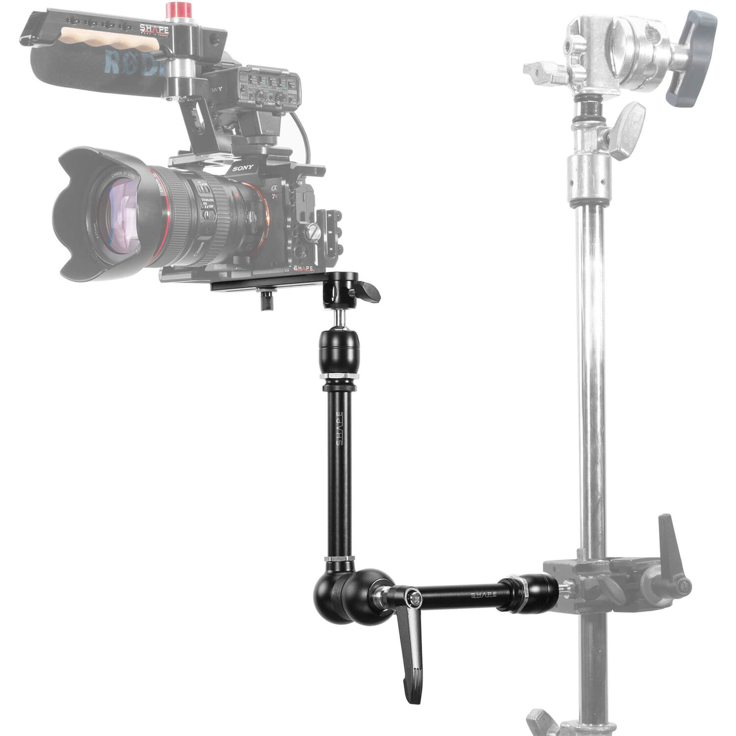 It is a fully articulated arm with 90° pivotable and 360° rotatable ends, and an elbow that rotates 360°. The knob allows partial loosening for safe and precise positioning of a light head or camera. It has 5/8" studs on ball joints at both ends with 3/8 and 1/4" female threads. Although it is supplied with a camera platform, it requires a Super Clamp or Base (available separately) for use.