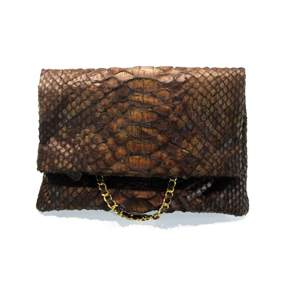 This chocolate brown handbag comes in a fold-over flap design. The delicate snakeskin construction gives a fine and smooth texture. The golden braided handle brings a more luxurious vibe to the handbag.