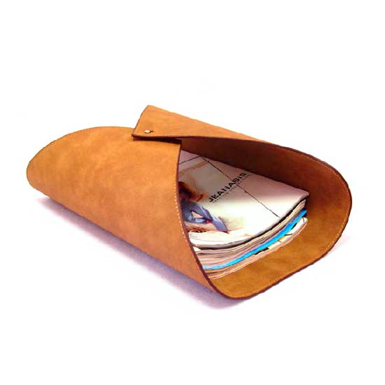 This foldable magazine holder is made of faux leather and features a reliable button closure. The brown-tone finish presents an elegant and stylish look. This stylish magazine holder looks great in any room and helps keep books and magazines tidy.