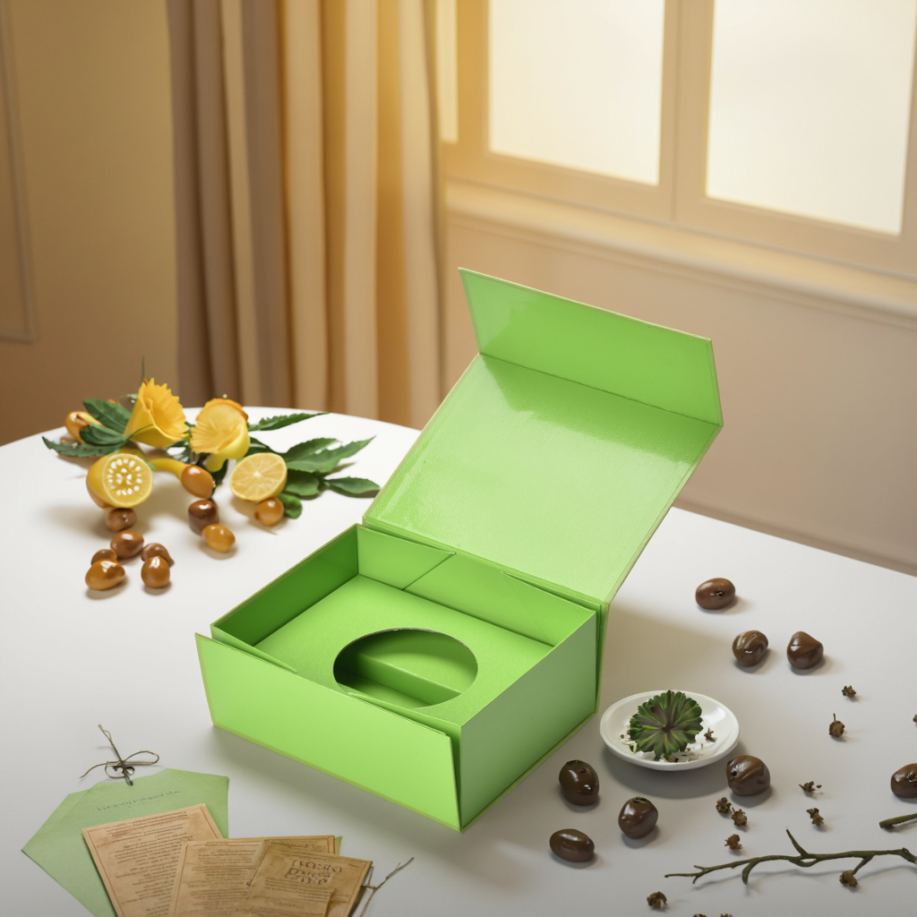 This folding gift box is exquisitely crafted from high-grammage cardboard. Three-dimensional molding is achieved through ingenious folding design. It combines both aesthetics and practicality. The box body is magnetically closed and can be completely flattened when unfolded, greatly saving storage and transportation space.