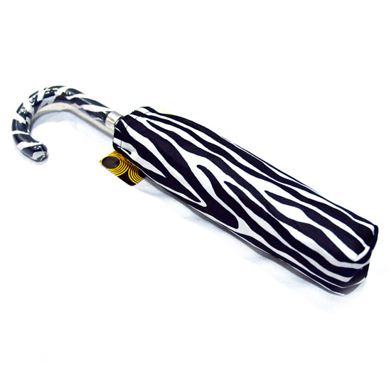 This fashionable umbrella features black and white zebra patterns on the exterior. It is designed with a hook-shaped handle for added style. The compact foldable umbrella can easily fit into any lady's handbag.