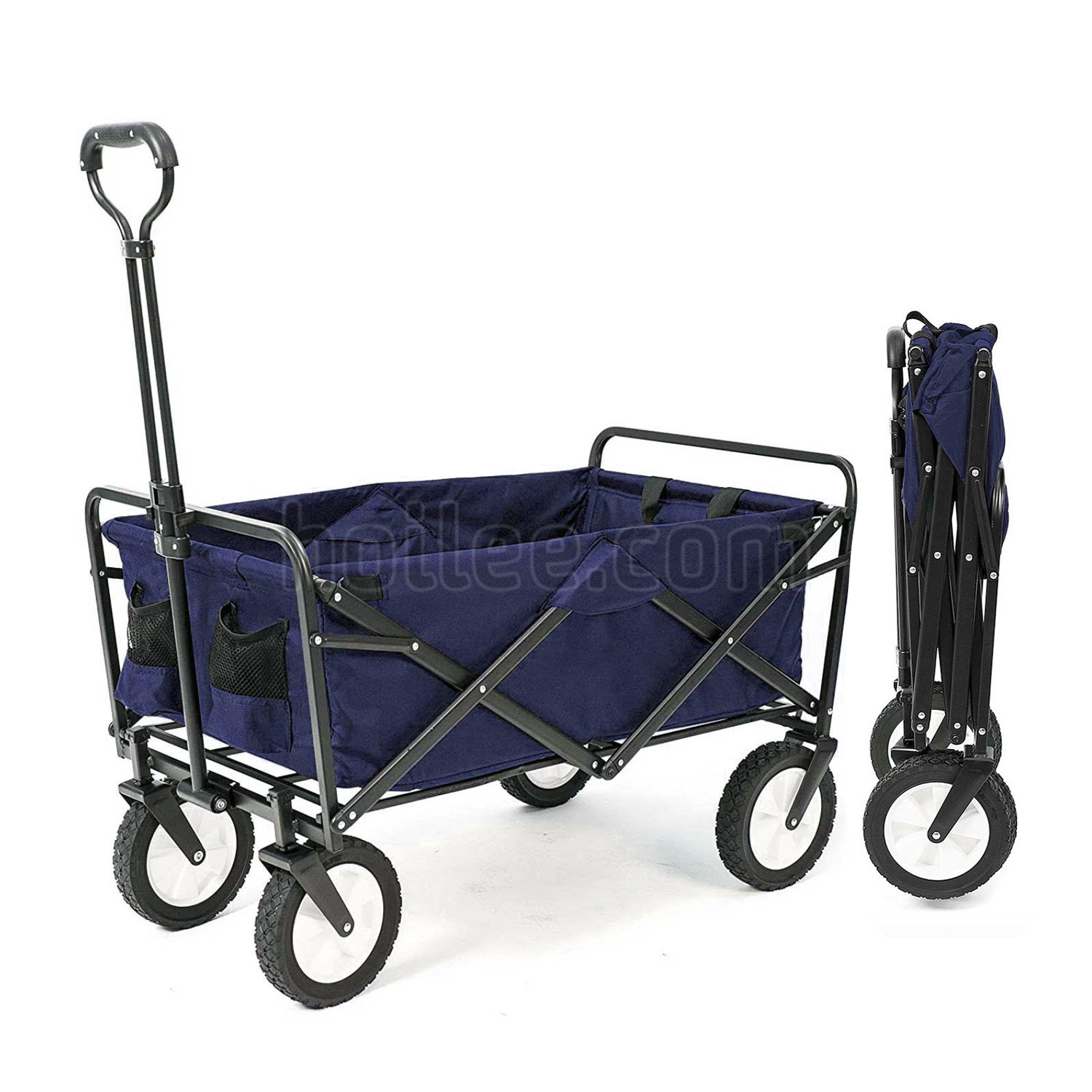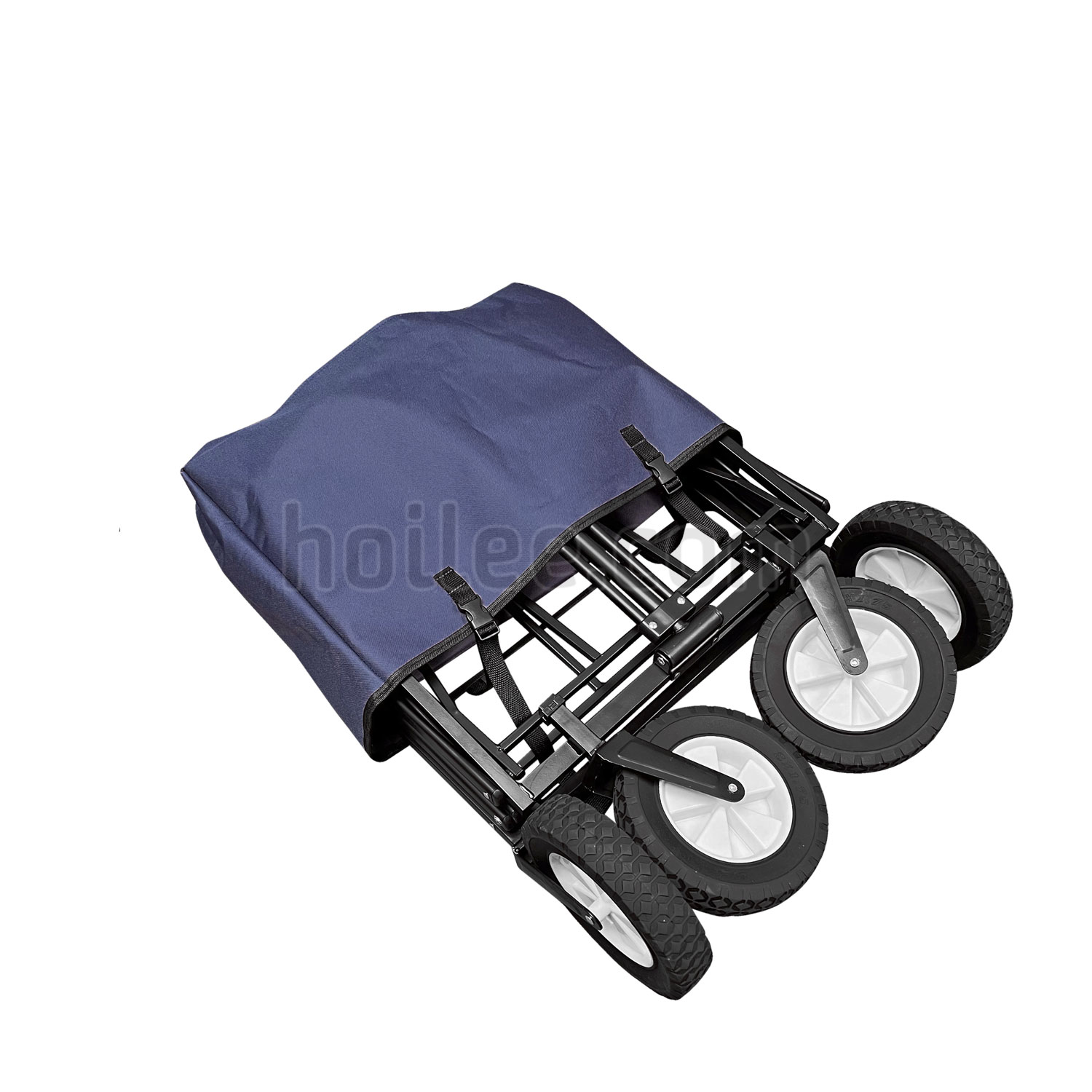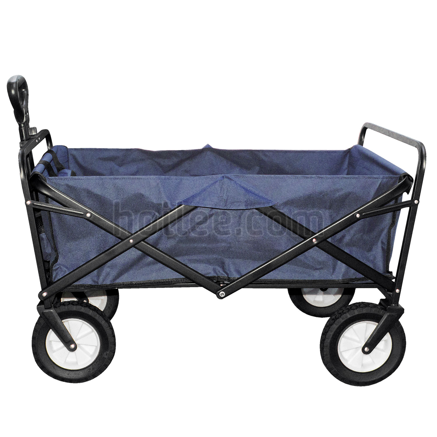 The large load folding wagon cart opens to approx 50.5 x 88.5 x 105cm. The collapsible utility wagon cart fold is 50.5 x 72 x 19.5cm. The ground to the top of the handle is 105cm". Two mesh cup holder beverages are safe and sound. Robust steel frame construction holds up to 220 pounds.