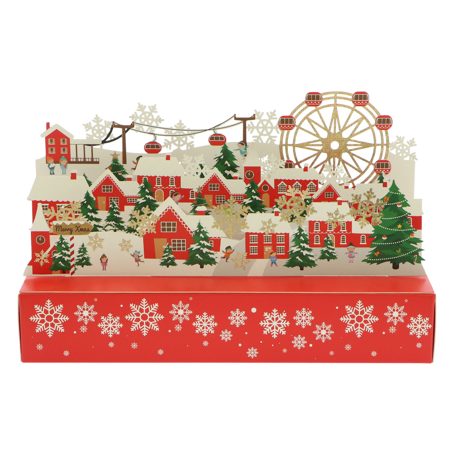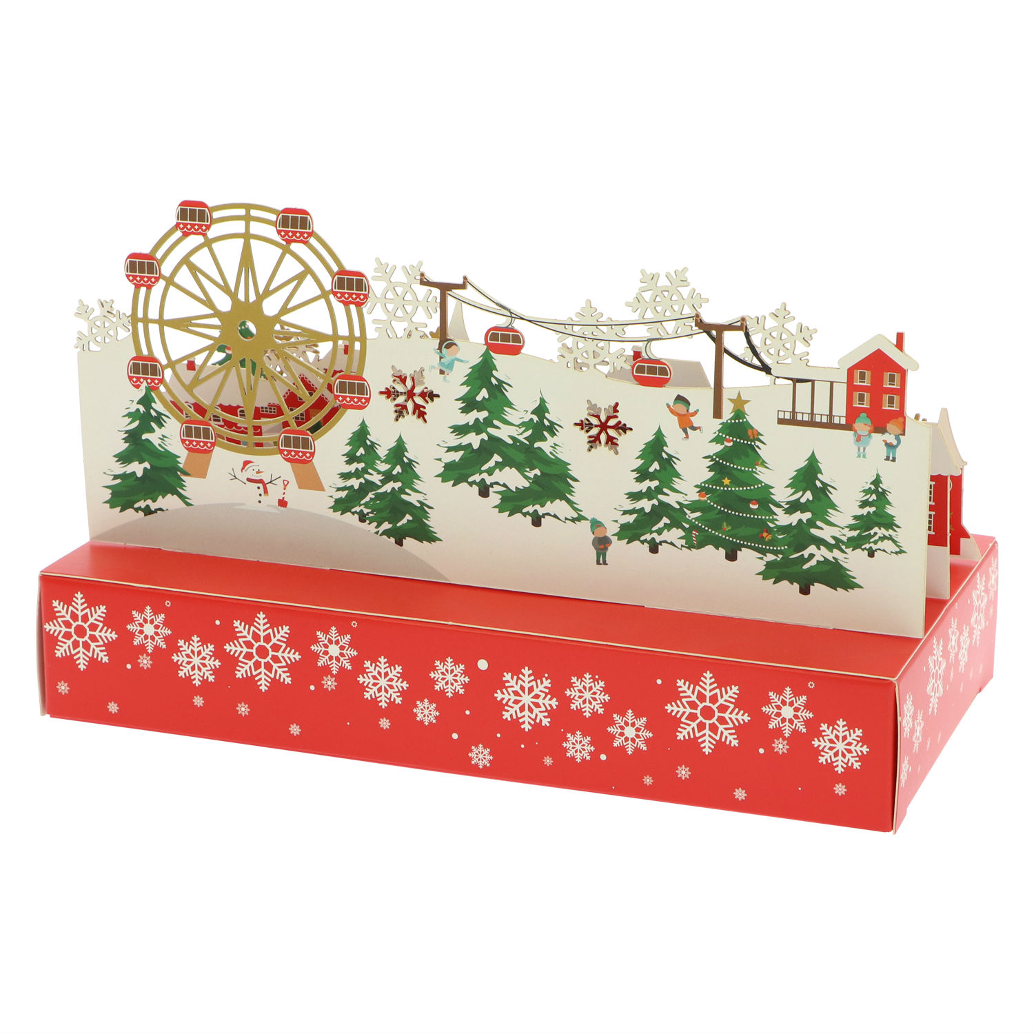 Amaze your friends and relatives by storing your gifts in this adorable and festive gift box. This gift box comes with a cuboid-shaped box to store your homemade cookies or photo frame. On top of the box sets a two-sided pop-up Christmas scene attachment, with one side showing a village-like view with houses that got their roofs covered in snow and snowflakes for a warm and festive look. The other side features a snow-covered mountain with a romantic Ferris wheel. Place your DIY presents in this gift box, gift them to family and friends and let them double this as a cute decorative item for Christmas.