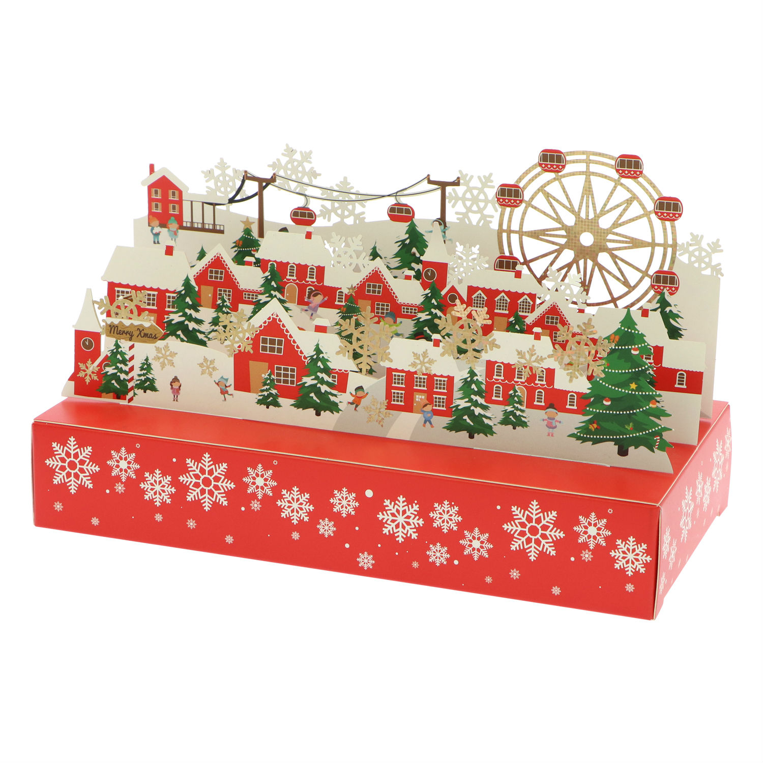 •  A folding gift box with a two-sided pop-up Christmas scene attachment.