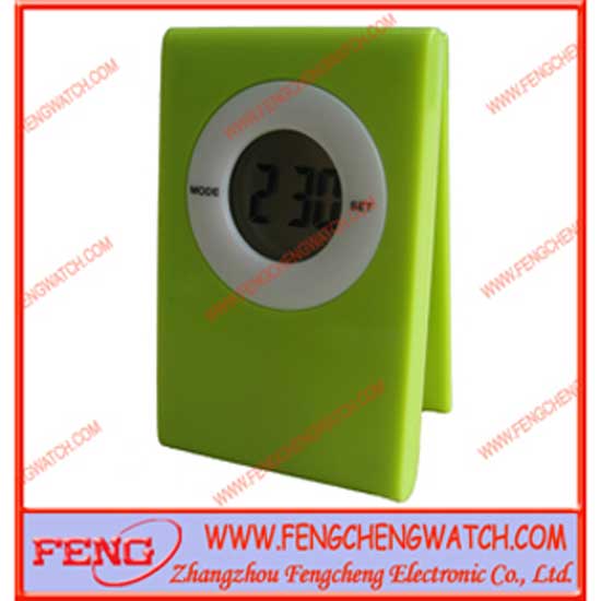This novelty clock flaunts a fresh, green color. A white ring-shaped button gives this clock a youthful style. Made with a folding design, this clock can be stored conveniently while not in use. This clock is suitable for use during travel or at home.