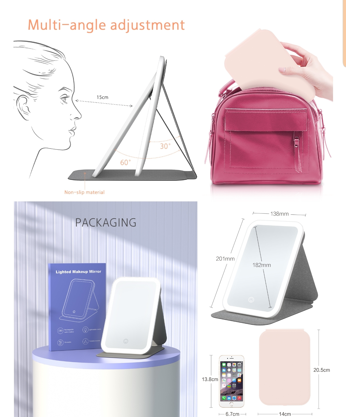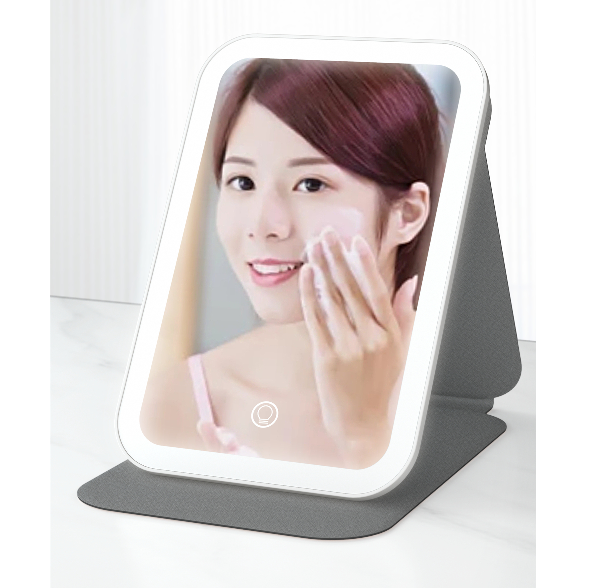 This mirror is pretty and easy for travel.It has three different color settings and you can adjust the brightness.