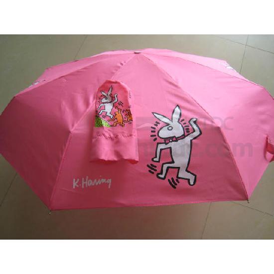 This 5-fold umbrella has a metal shaft with fiber glass ribs and provide good rain protection with fabric panels. The panels of this umbrella are made of fabric and are adorned with a cartoonish rabbit. It has a straight plastic handle to ensure a good grip and comes with a matching pouch for easy storage.