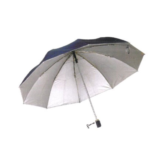 This is a folding umbrella with a durable structure. It features a robust canopy with a black exterior and a silvery interior. The black handle comes with a strap for easy carrying. we can accept 200pcs (4carton)order.