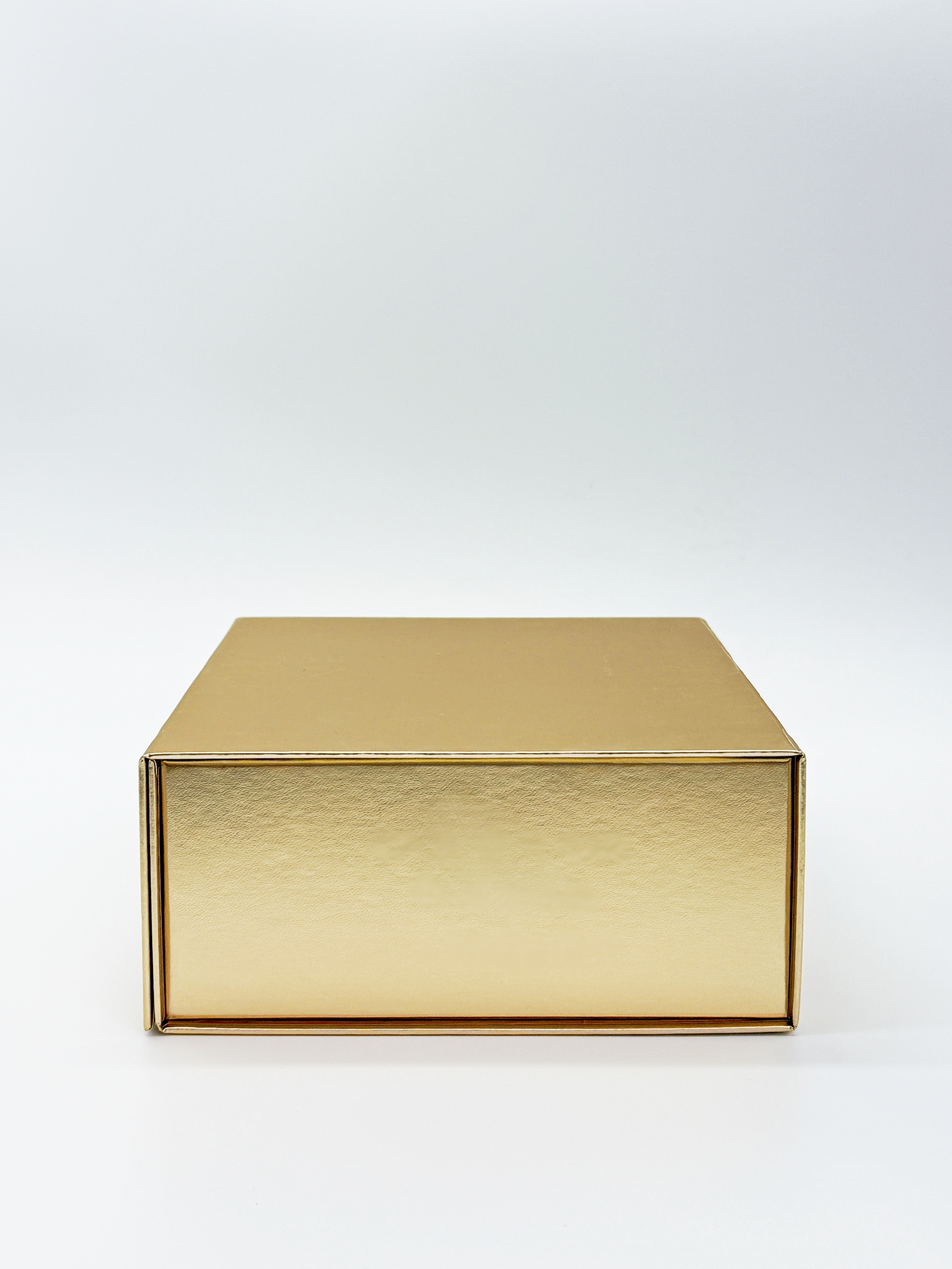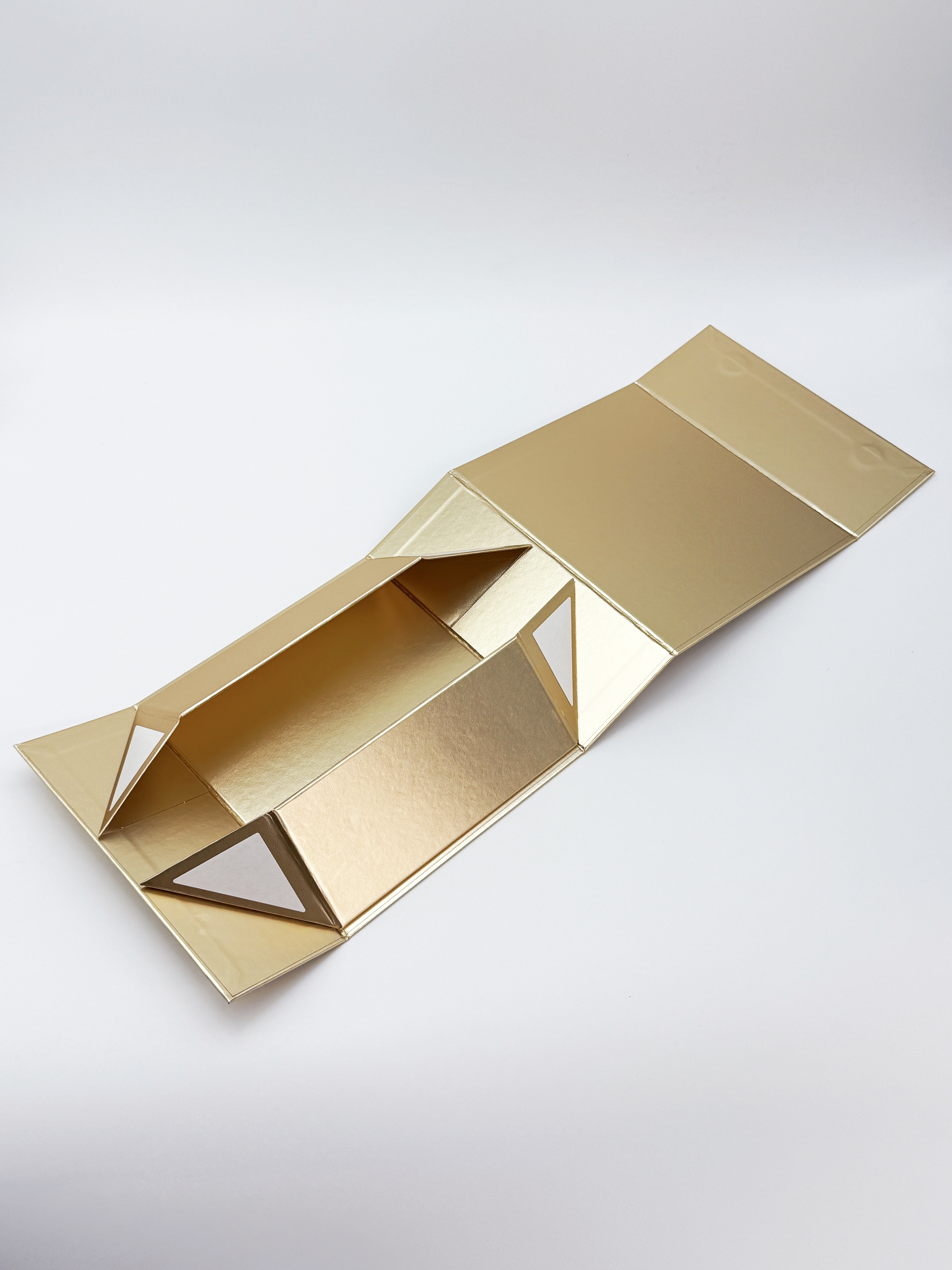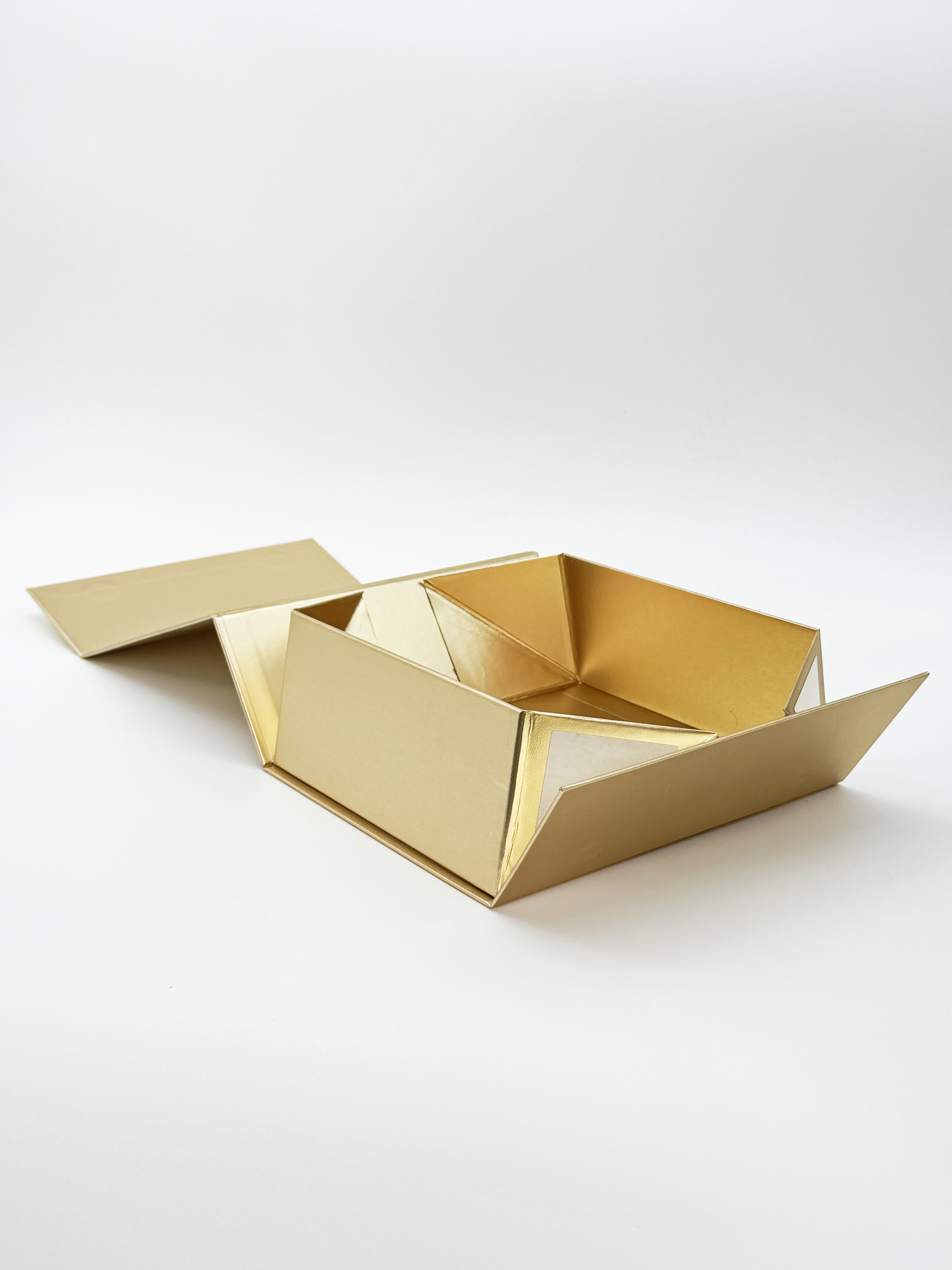 Folding gift boxes, also known as foldable hinged boxes, are rigid boxes that consist of a tray glued to the base and a lid with magnets that securely close the box. These can come in collapsible versions that can be flattened or in fully assembled versions .