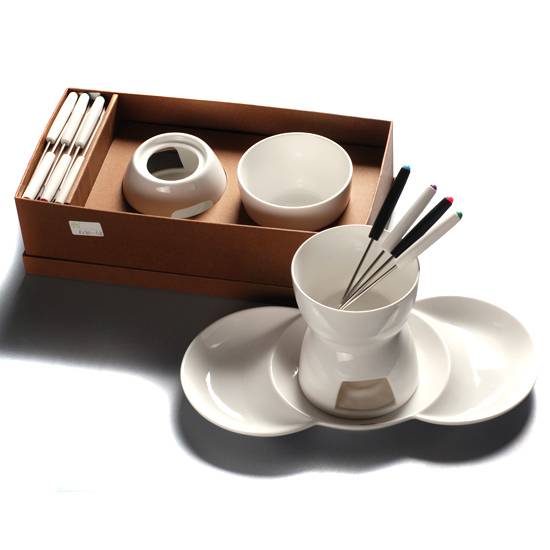 As shown is a fondue set consisting of a pot, forks, bowls etc. Made of quality material, this fondue set is strong, tough and durable. Coming with a presentable gift box, this fondue set is best for gift for friends.