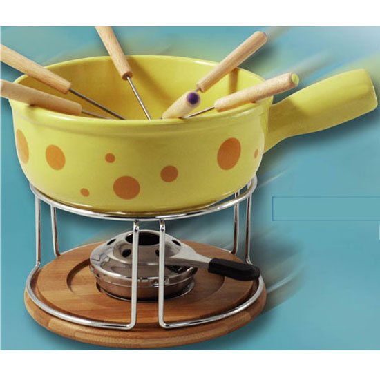The fondue set includes a ceramic pot, a wire rack, a bamboo base, etc. The pot is heated by a stainless steel burner. This set is also accessorized with 6 forks.