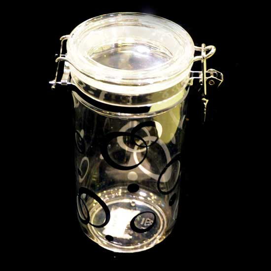 Displayed here is a cylindrical food canister with a transparent exterior. The ring and dot patterns lend extra style to the appearance. The top is designed with a tight-fitting lid closed by a snap-on clip to keep the snacks inside from air and dirt.