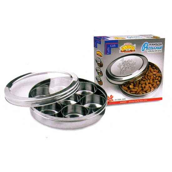 This food container comes in a circular shape. It comes with six mini cups in simple design. The transparent lid is adorned with graceful floral patterns. This food container is ideal for containing snacks and nuts.