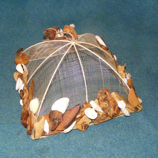 This is a food cover. The food cover is made of quality sinamay which protects the food from spoilage. The edges of the food cover is decorated with sea shells and dry tree barks, which creates a natural feeling.