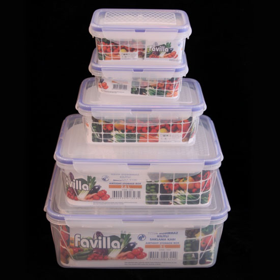 The photographed set of containers is designed for food storage use. The copolymer construction guarantees lasting use. The food storage box set is available in different shapes such as rectangular, square and round shapes for meeting different requirements.