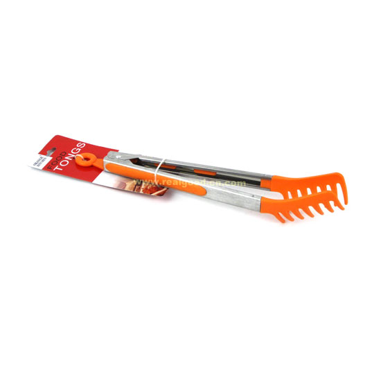 This is a pair of food tongs with indented heads. It features an ergonomic design for easy use. This pair of tongs comes with a hanging loop for added convenience.