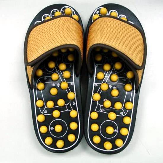 This is a pair of foot reflexology slippers. Reflexology is an ancient Chinese therapy that can improve blood circulation. The slippers can also be used as a massager upon wearing.