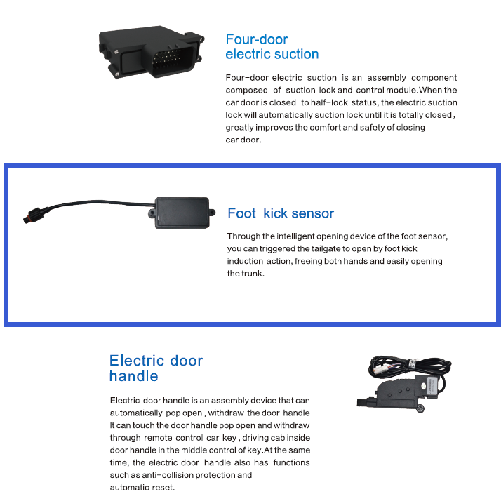 Foot kick sensor(Optional): Open your boot with your foot when your hands are not free, you can open your vehicle with just a kick of the foot. Simply wave your foot under the rear of your car, no more fumbling around for keys: As long as you've got your Smart Key on you, you can easily open the rear liftgate with your hands full.