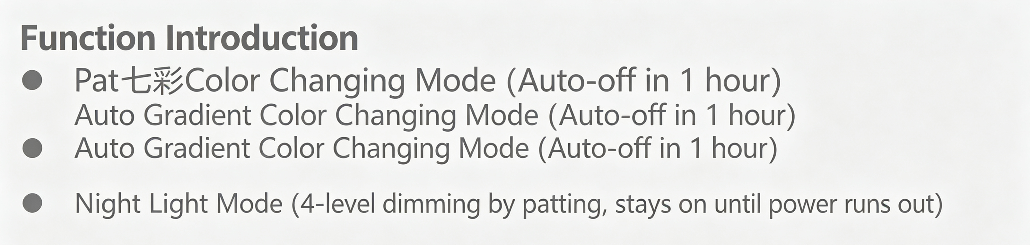- Night light mode with 4-level adjustable brightness, stays on continuously until power off