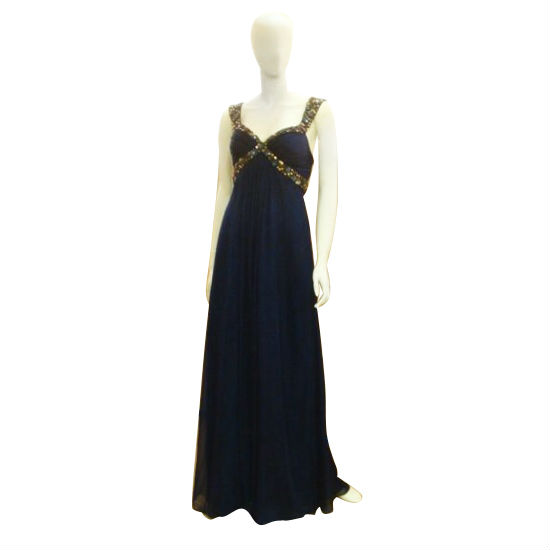 The sultry evening dress is highlighted with glistening straps, which enclose the bust to form an X shaped pattern around the sweetheart neckline. Gathered pleats in the front run down to the floor with elegance, defining an empire waistline. Pair the gown with smokey eyes for an alluring look.