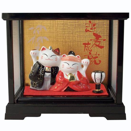 This is a display set featuring two ceramic cats with a theme of a Japanese wedding. The wall of the display is carved with a Chinese phrase, which stands for a successful relationship. This item is an ideal gift for couples.