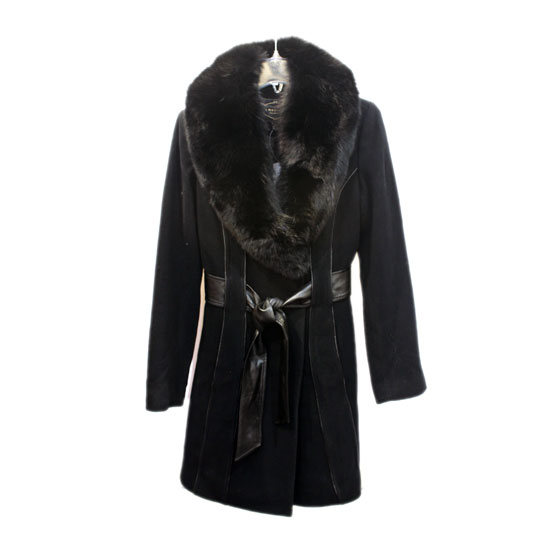 Featured here is a luxurious ladies' coat designed with a luscious fur collar. This coat comes with a slim shape that flatters the female body. A leather-textured belt adds a chic touch to this garment.