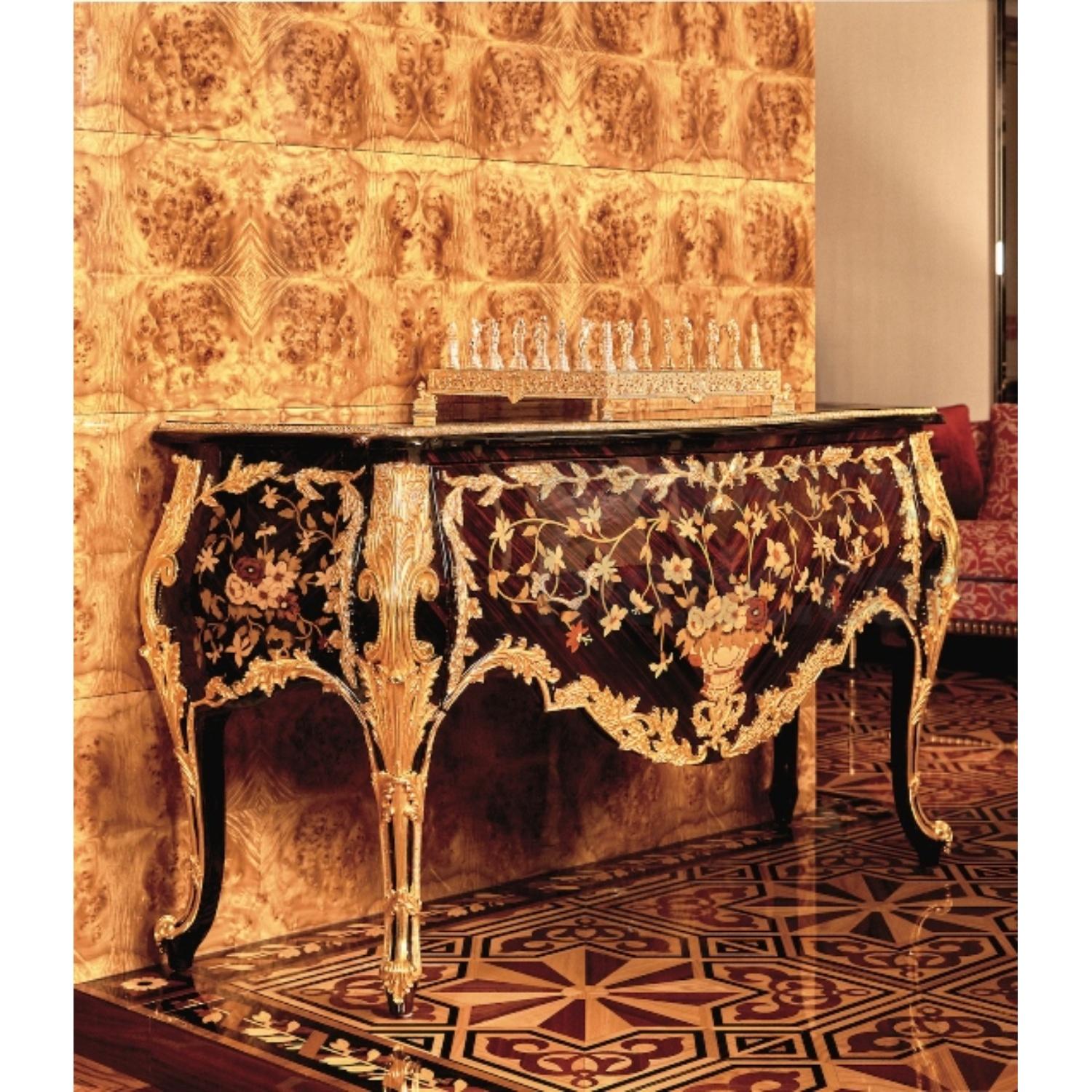 • A charming foyer table in wood with floral and leafy decorations in various shades of gold amber and brown.