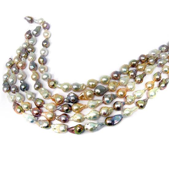 These are temporarily strung fresh water pearls for jewellery making. They are in different baroque shapes and assorted colours, such as white, purple and orange. The price varies according to the size and the quality.