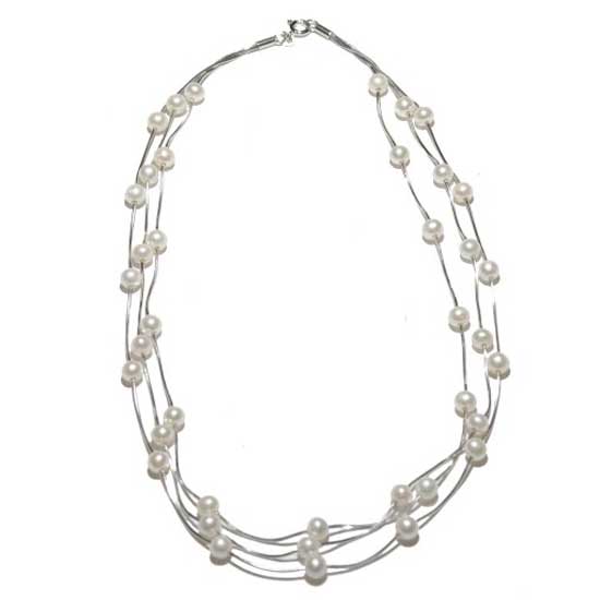 Presented here is a 3-strand sterling silver necklace with white gold plating. The strands are embellished with fresh water pearls for added elegance. Featuring a decent design, ladies will surely fall for this delicate fresh water pearl necklace.