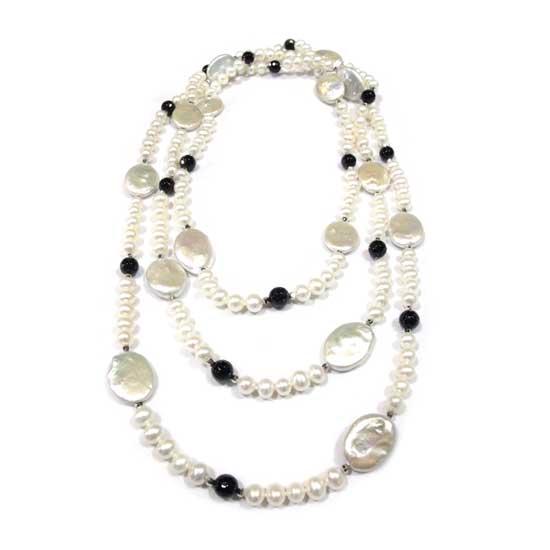This necklace with a three-ring design is highlighted by round white fresh water pearls and black agates alternating with each other. The oval silvery-toned plates lend extra appeal to the look. This fashionable pearl necklace is easy to mix and match.