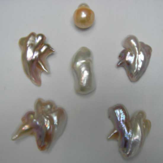 Featured is a collection of fresh water pearls coming in irregular shapes. The natural luster of the pearls looks exceptionally desirable to ladies. The unique shapes of the pearls bring great characters to jewelry designs.