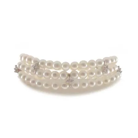 Triple-strand freshwater cultured pearl bracelet exhibits pearls of round-shape 5-5.5mm in white and cubic zirconia stones with silver rhodium.