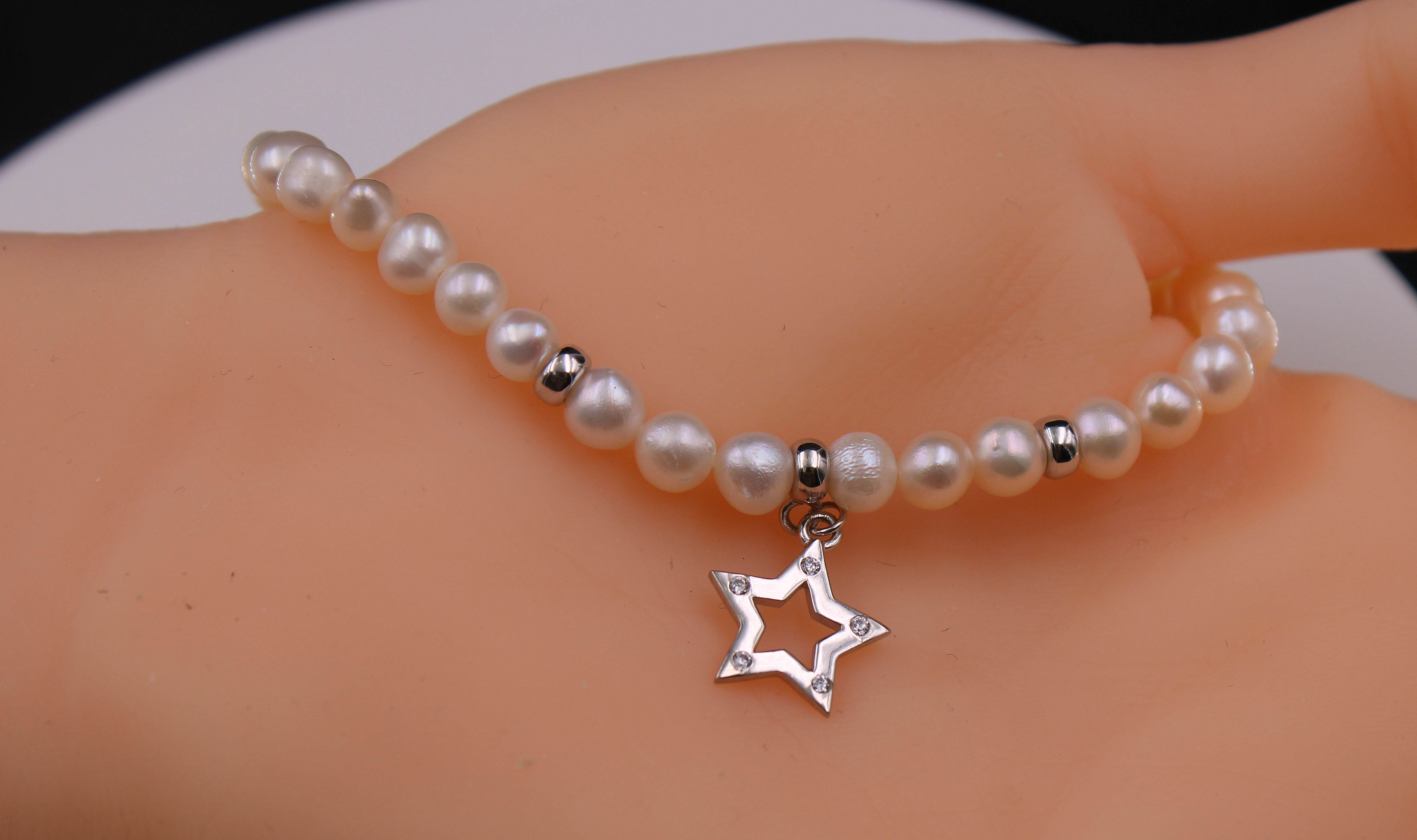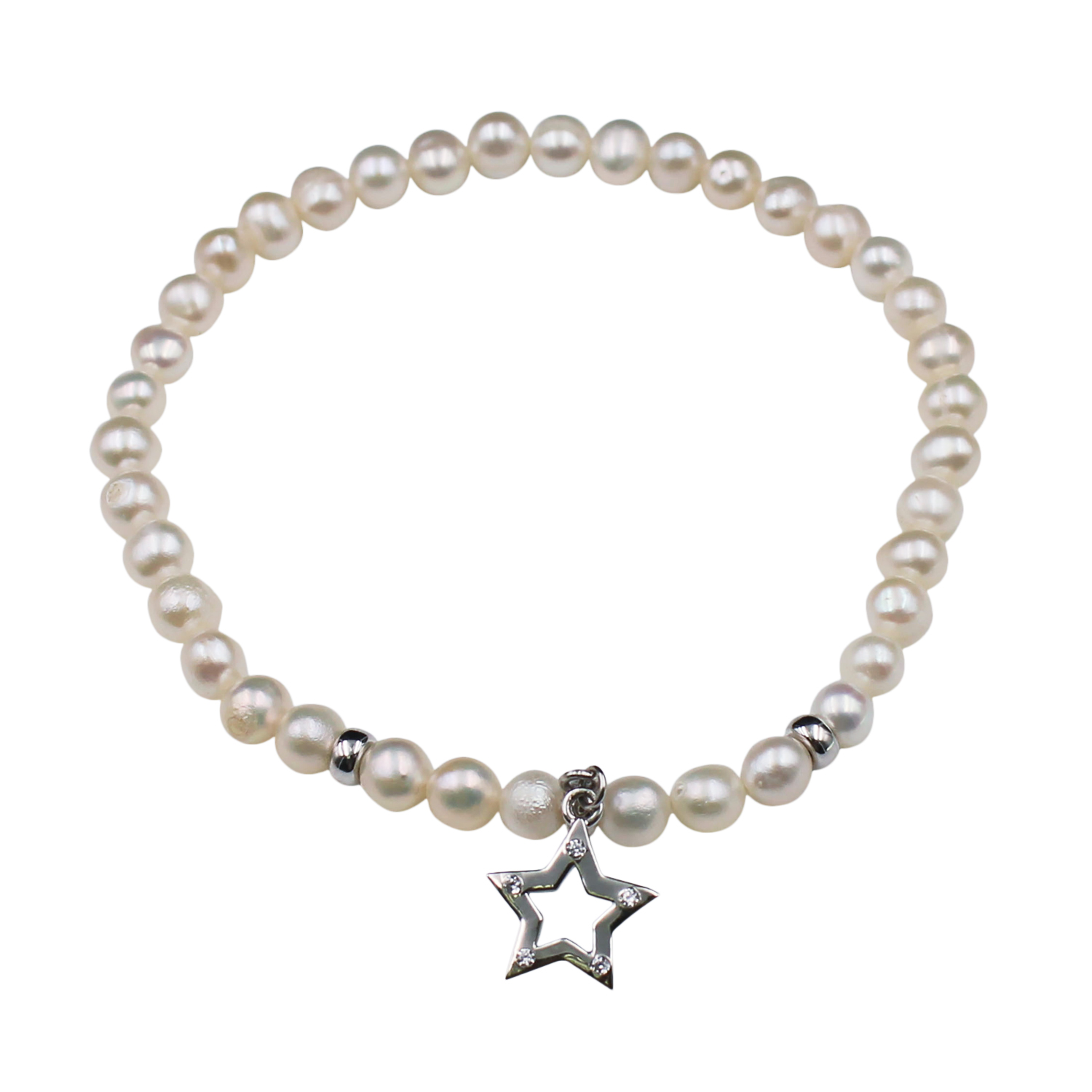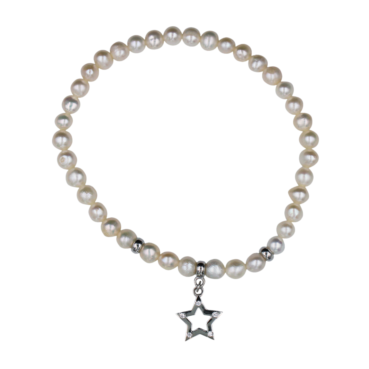 • A freshwater pearl bracelet with sterling silver beads and an embellished star cut-out charm.