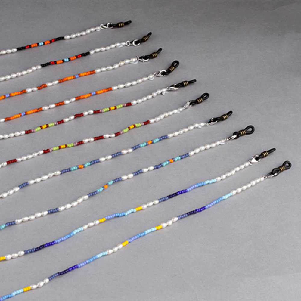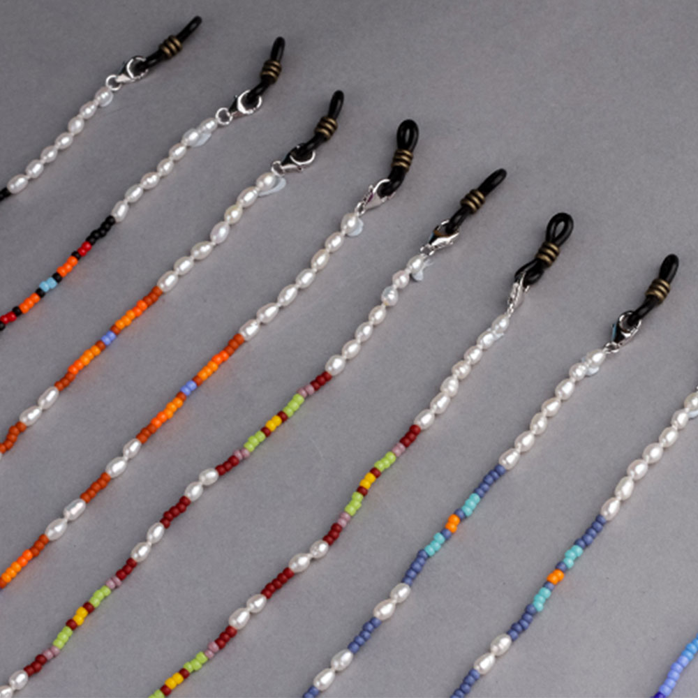 STERLING SILVER EYEGLASS / MASK CHAIN WITH COLOR BEADS AND 3-3.5MM OVAL FRESHWATER PEARL, RHODIUM PLATED (CAN WEAR AS NECKLACE)