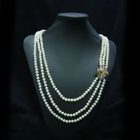 This natural freshwater pearl necklace features a multi-layered design with 3 chains. The cubic zirconia stone elements add a magical touch to the whole piece. Present this delicate pearl necklace to your beloved lady at Valentine's Day.