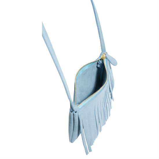 This crossbody bag is crafted from suede leather with on-trend fringe accents. The trim leather silhouette is finished with a zip-top closure and an adjustable shoulder strap. This crossbody bag makes an ideal companion for everyday wear.
