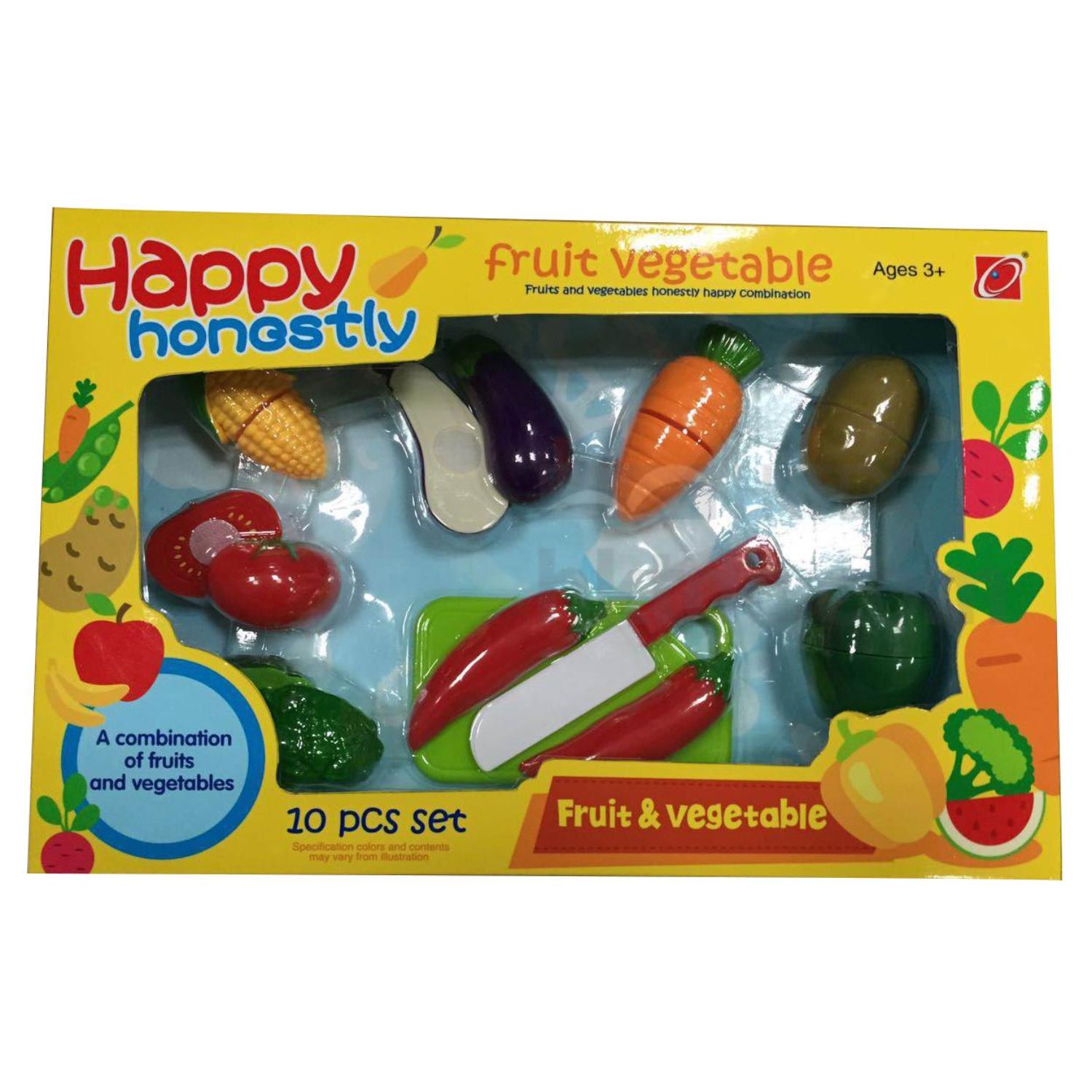 Nurture the culinary talent in your kids with this fruits play set. This kitchen pretend play set comprises a batch of fruits and vegetables including maize, tomato, eggplant, potato, pepper, carrot, etc. All of which are cut into halves, and tots can cut veggies effortlessly and safely by using the toy knife and chopping board equipped.