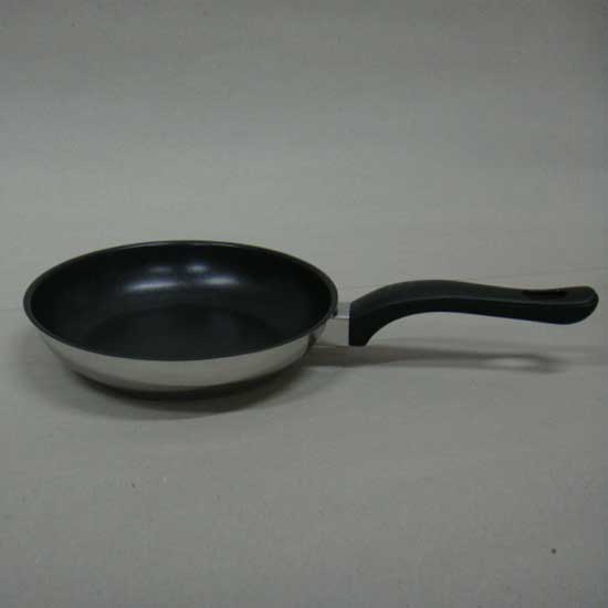 Photographed is a taper fry pan made of stainless steel for enhanced durability. The fry pan comes with a non-stick coating, offering a solution to easy cooking. The handle is built with bakelite to ensure safety.