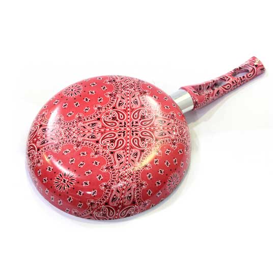 Showcased here is a fry pan in vivid red with alluring patterns. The handle is skillfully designed with padding to prevent your hand from burning. Made of aluminum alloy, this fry pan promises robust construction and first-rate durability.