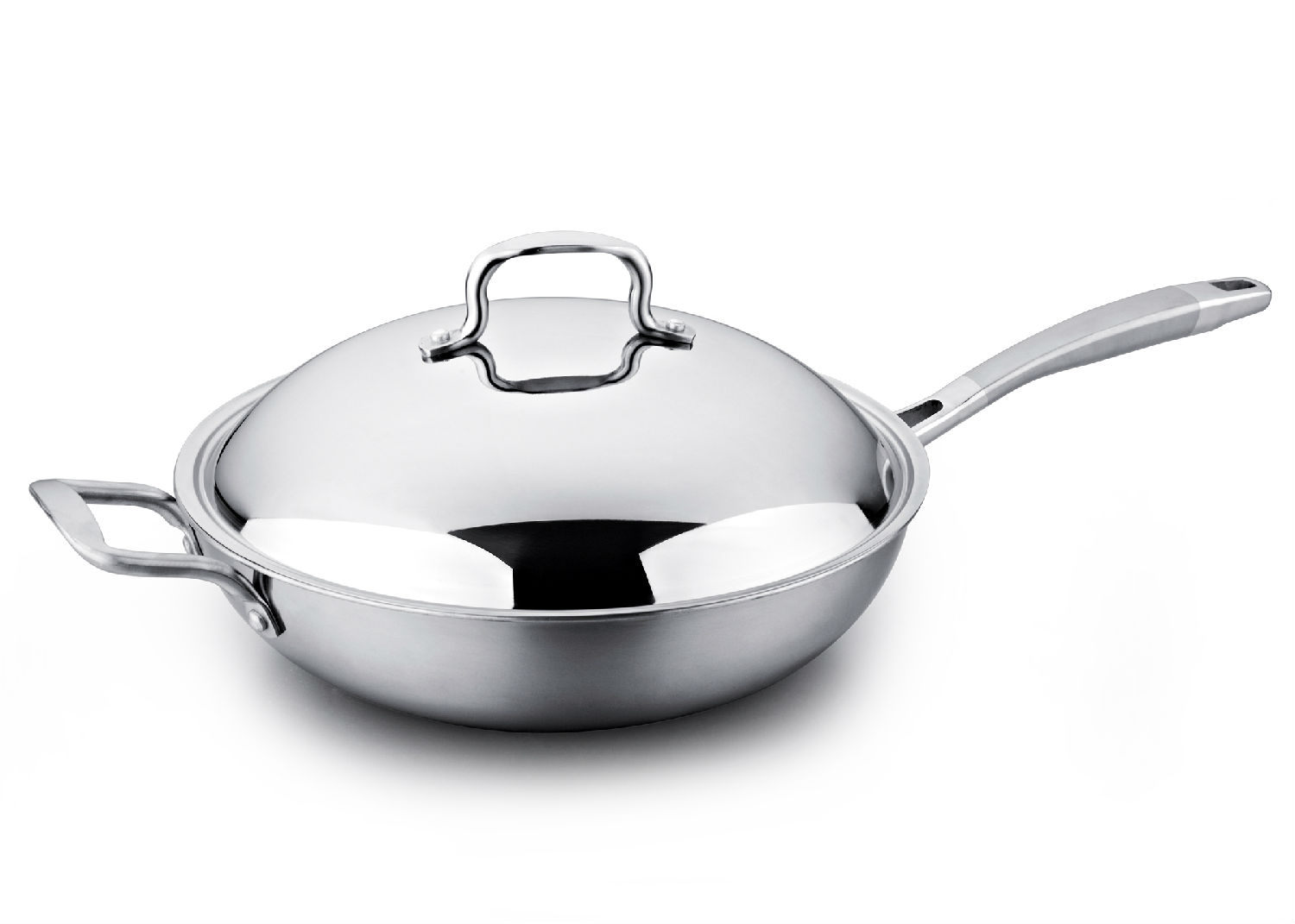 The featured frying pan is made of stainless steel and is round shaped. It has two handles on the sides and is covered with a handled lid. This frying pan has a glossy metallic exterior and is convenient to cook with.