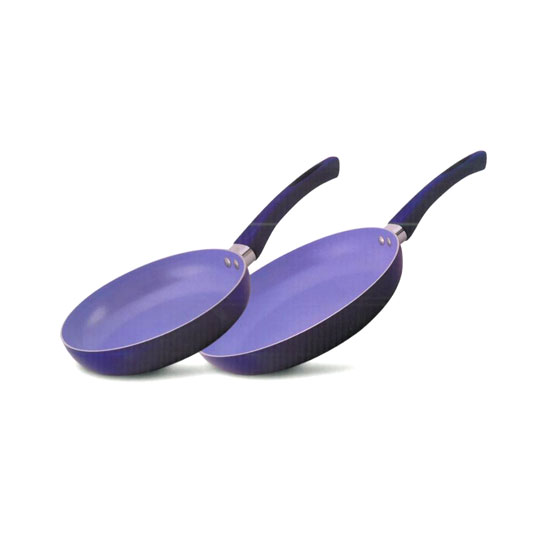 This frying pan set comes with 2 frying pans. The blue ceramic coating helps distribute heat evenly throughout the cooking surface. The large ergonomic handle allows a firm and comfortable grip.