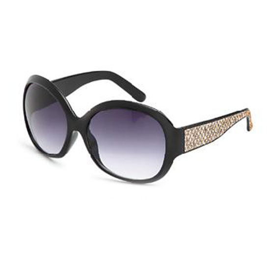 Pictured is a pair of sunglasses with oversized rims. The glittery accents on the temples offer added style and elegance. The contoured saddle bridge offers added wearing comfort.