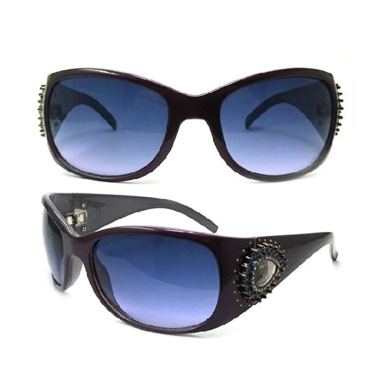 This is a pair of fashionable sunglasses with a full-rim design. The sunglasses come with a plastic frame for a long service life. The temples are designed with metal decorations with rhinestones for an eye-catching look.