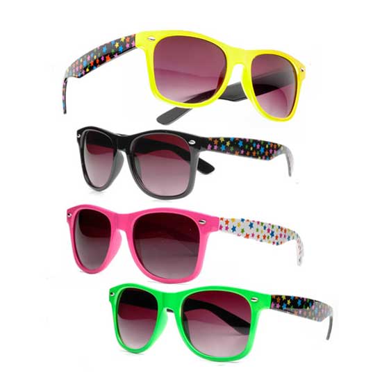 This is a pair of full-rimmed sunglasses in vivid colors. The temples are accented with colorful polka dots for a playful look. These full-rimmed sunglasses go great with street-chic look.
