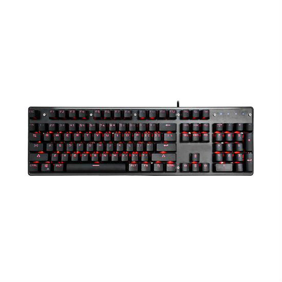 Featured here is a full size mechanical keyboard for gaming use. It has a total of 104 keys and comes in an English language layout. This keyboard provides two built-in gaming modes and has lights on particular keys.