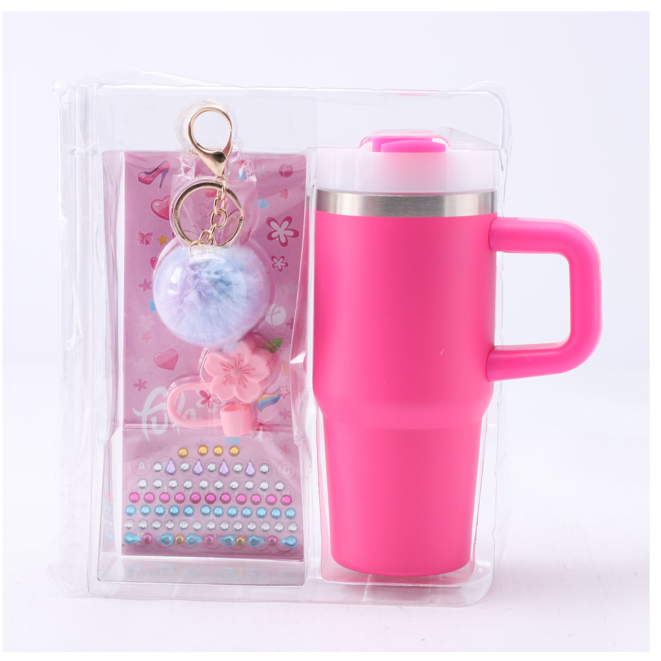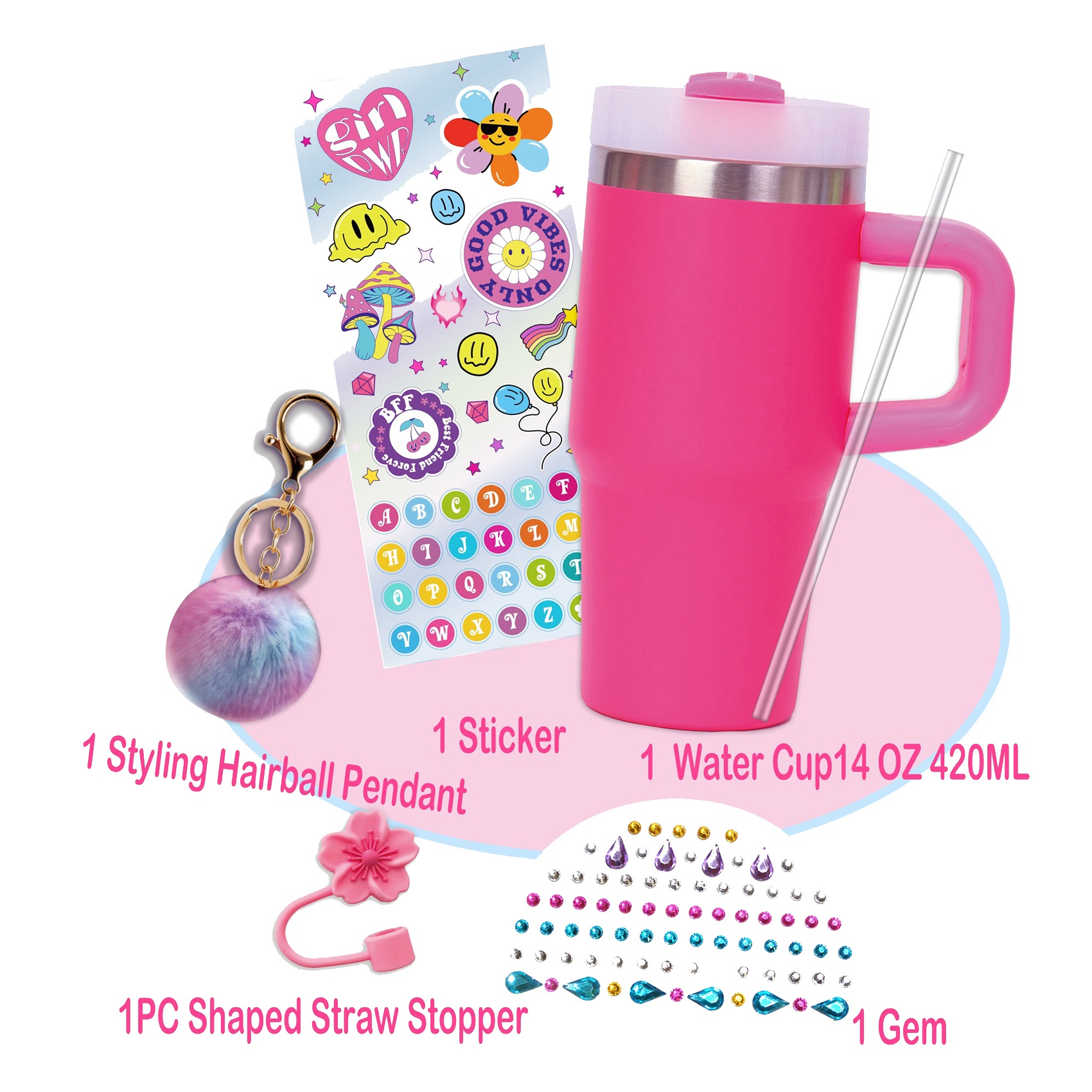 Each set includes: 1 water Cup 14.oz 420ml, 1 sticker, 1 styling Hairball, 1 pc Pendant shaped straw stopper, 1 sheet gem