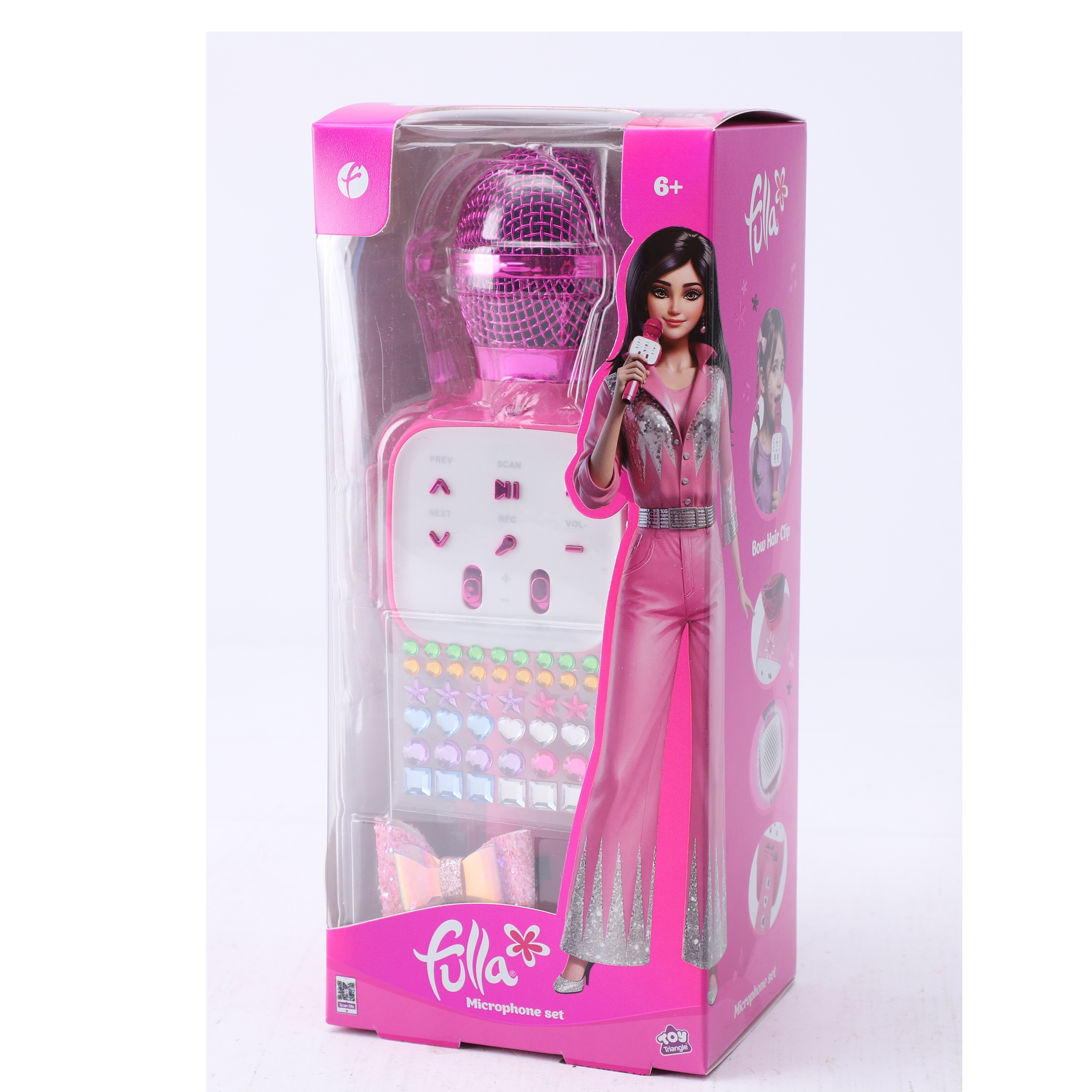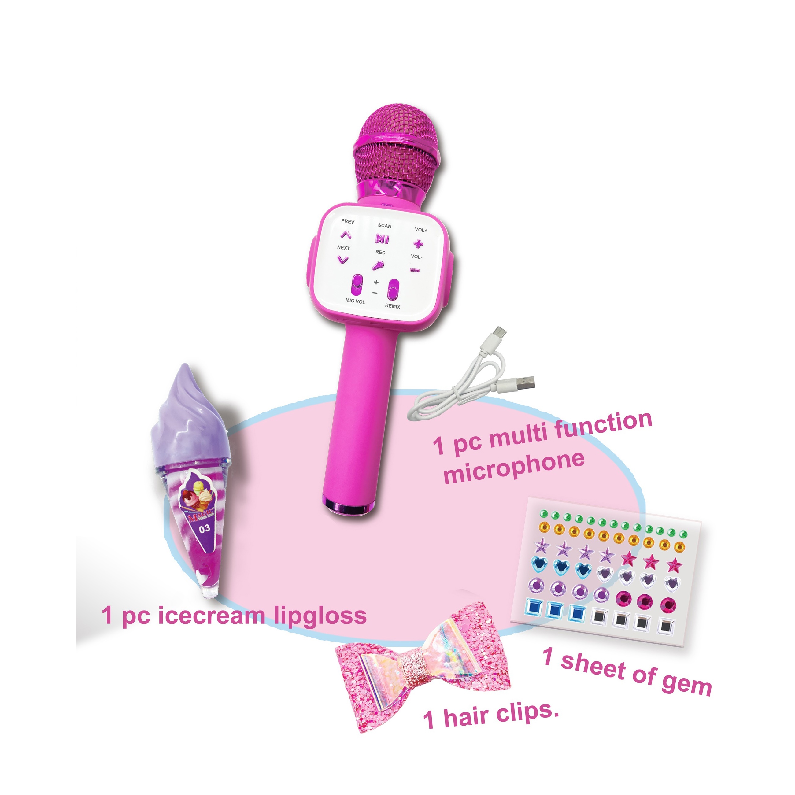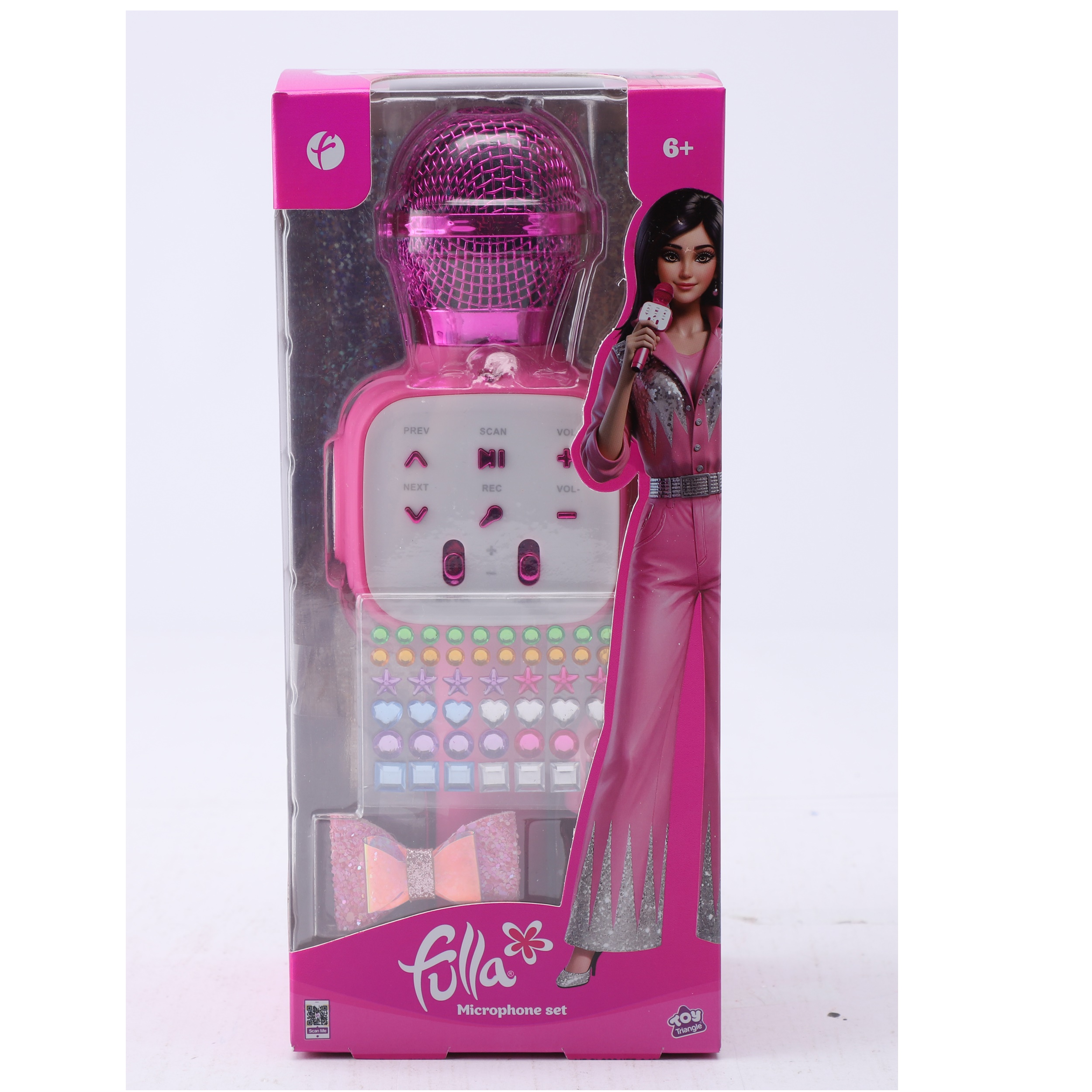 Fulla Microphone set includes a multi-function microphone, an ice-cream lip-gloss, a bow hair clip and a sheet of gem.