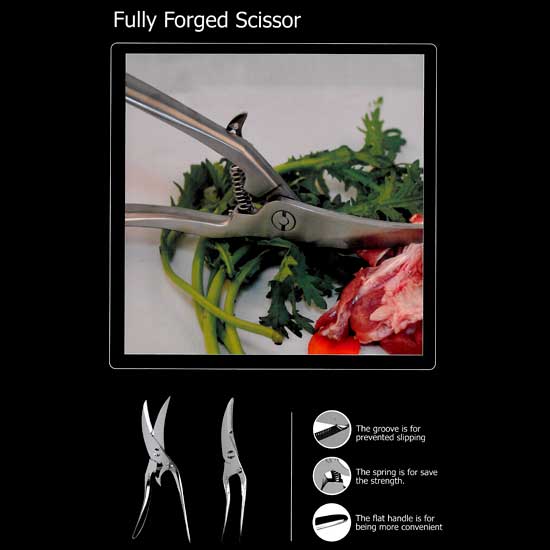 This pair of forged scissors flaunts easy-to-use properties. The handles boast grooves which prevent slipping in operation. The spring allows saving of efforts in cutting food.