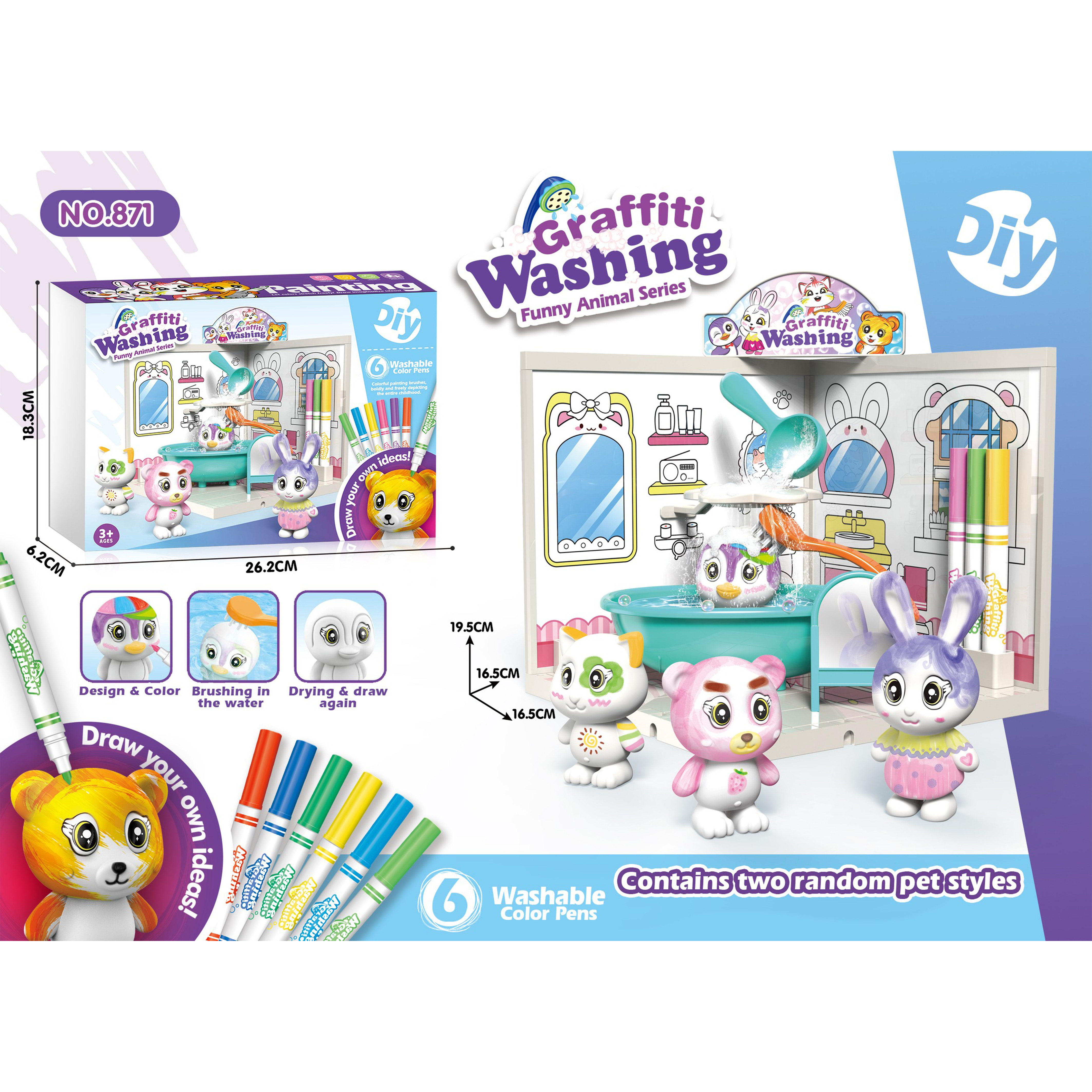 Includes 2 random styles of washable coloring dolls selected from four options (rabbit, bear, penguin, cat), along with 6 washable markers.