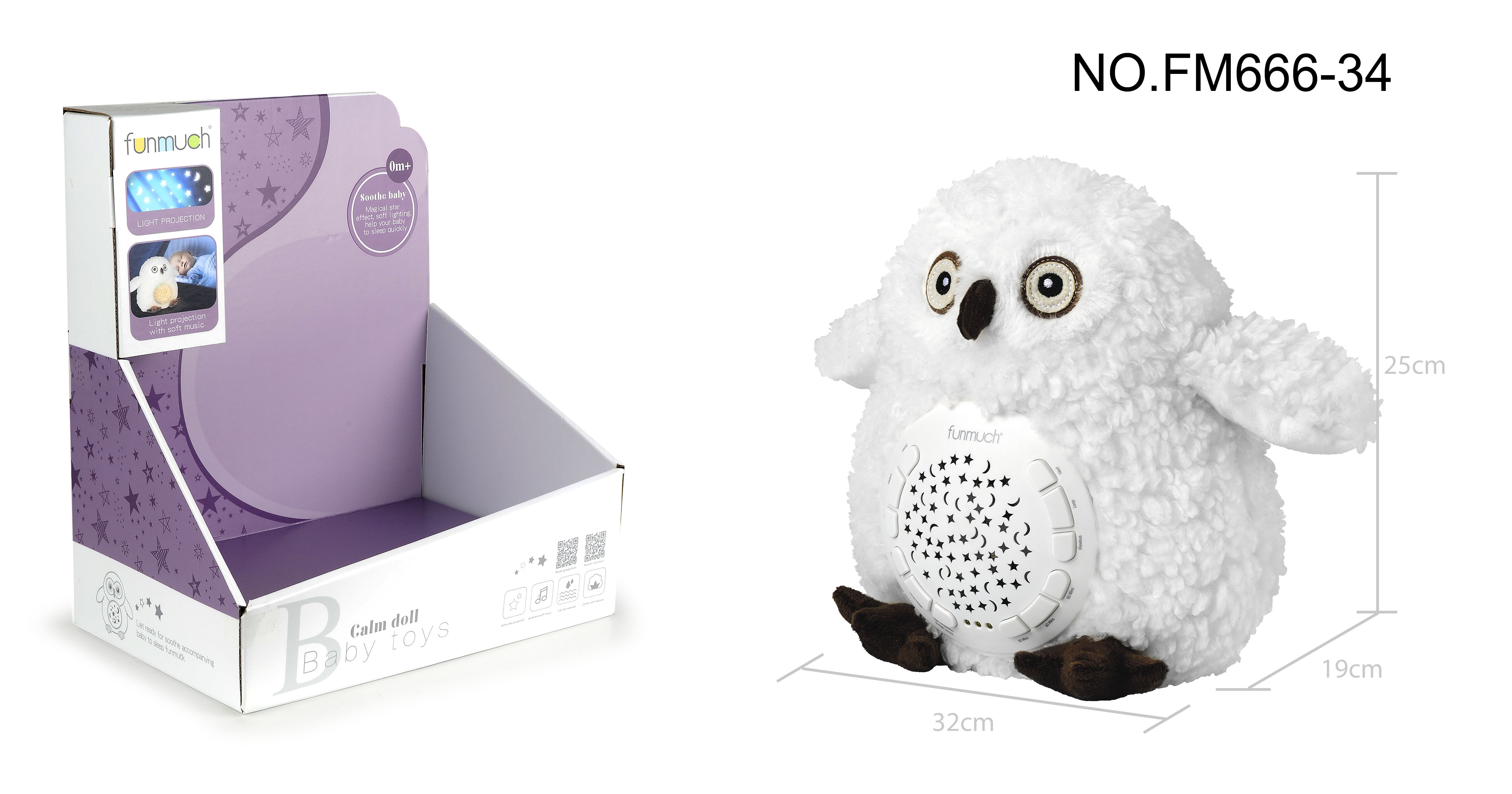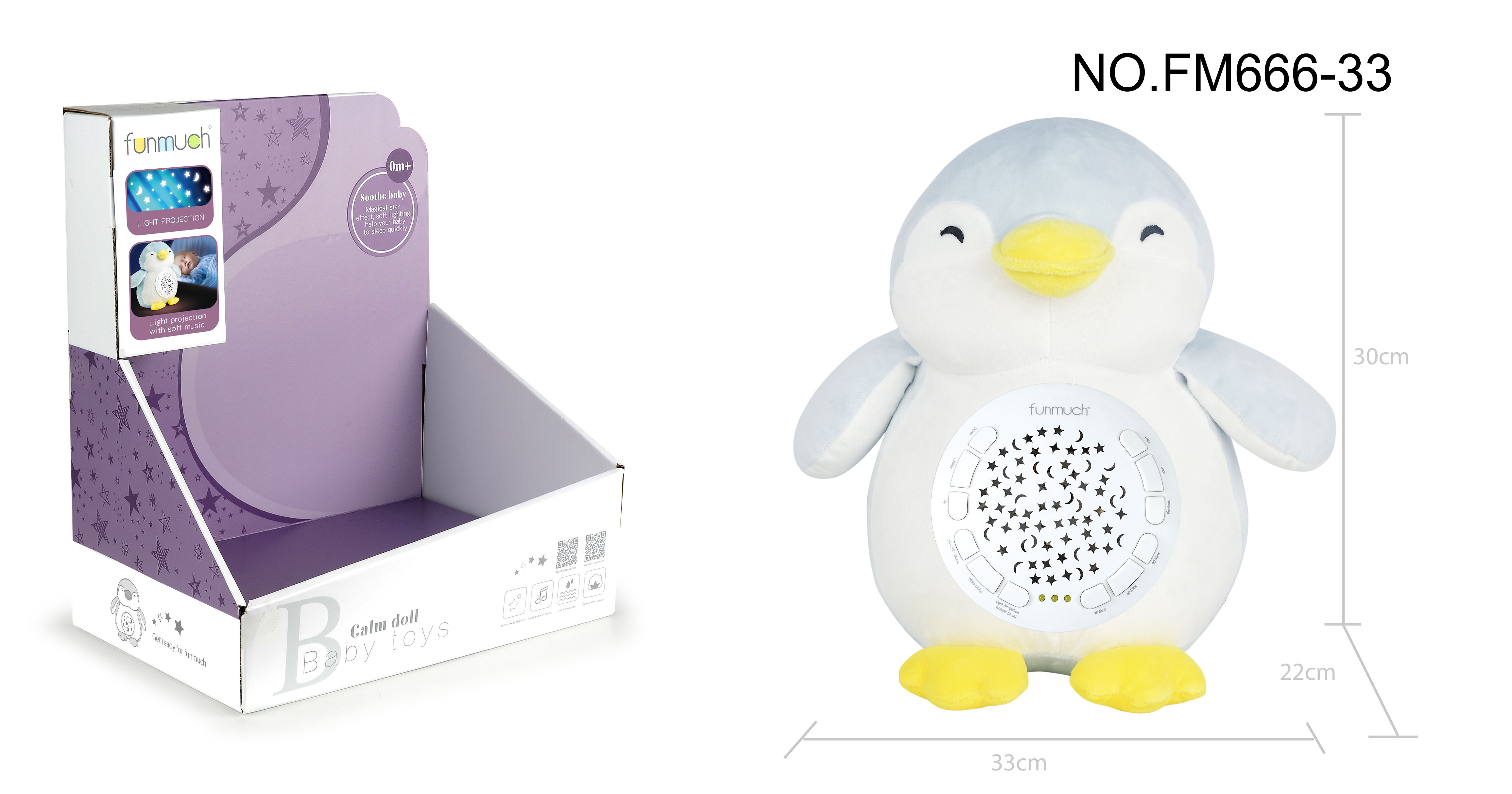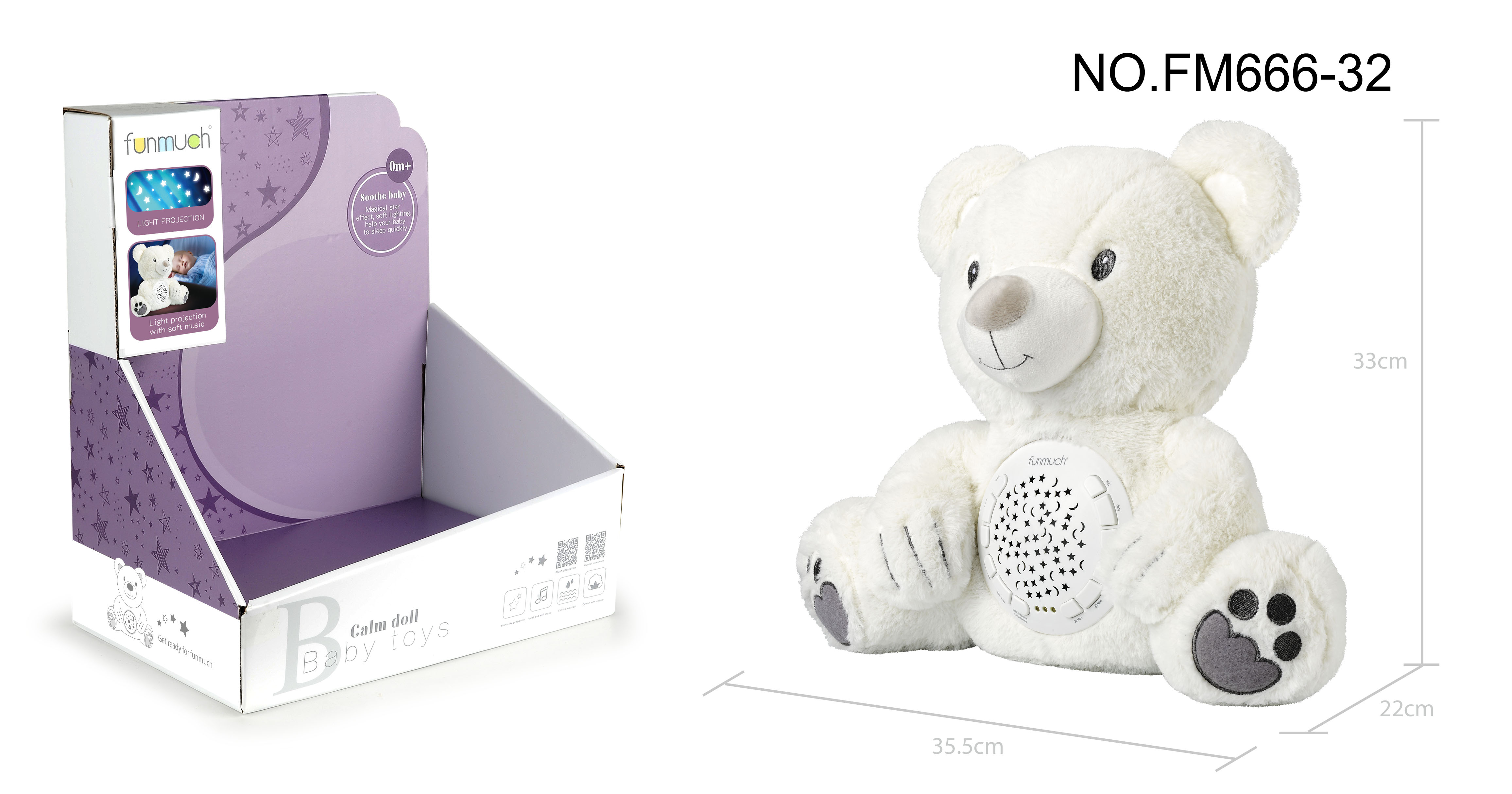 Washable, 12 keys, 6-color light with projection, 10 soothe songs, 10 lullabies, 5 white noises, 5 levels of volume, upper and lower songs can be switched, with timer. (ABS & polyester) (3*AA not included)